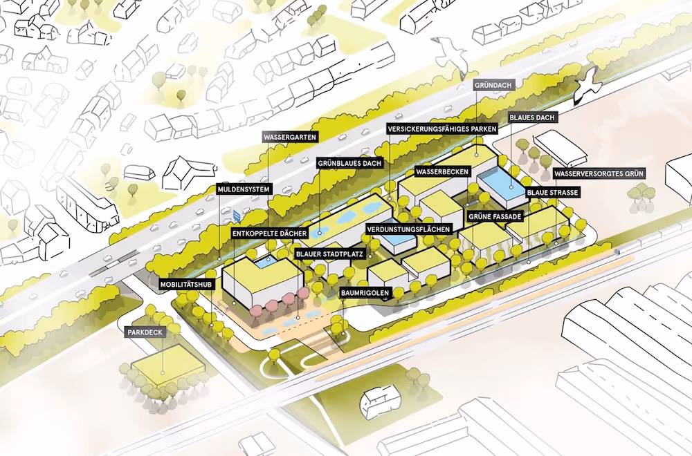 Für die Emschergenossenschaft und die Stadt Recklinghausen haben wir im Rahmen des Programms „Klimaresiliente Region mit internationaler Strahlkraft“ eine städtebauliche Machbarkeitsstudie für eine blau-grünes klimaresilientes Gewerbeareal am Bahnhof Süd entwickelt. Unser Maßnahmenkatalog zeigt die Integration von unterschiedlichen Ansätzen zu nachhaltigeren und klimaresilienten Gewerbegebieten.