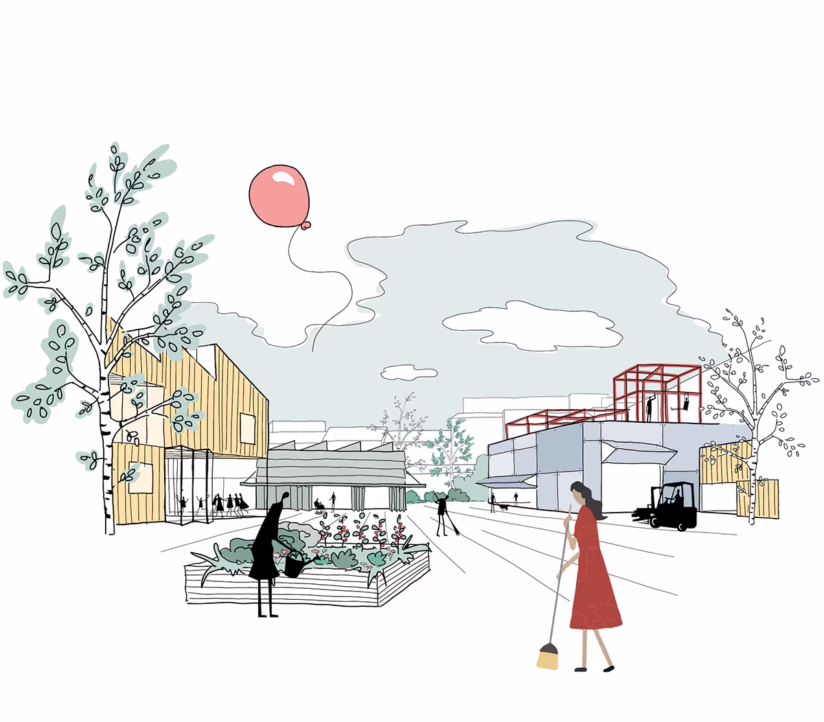 Das neue Gartenquartier definiert eine suburbane Dichte, mit der bis zu 400 Wohneinheiten am Standort realisiert werden können, viele davon für einkommensschwache Mieter*innen.