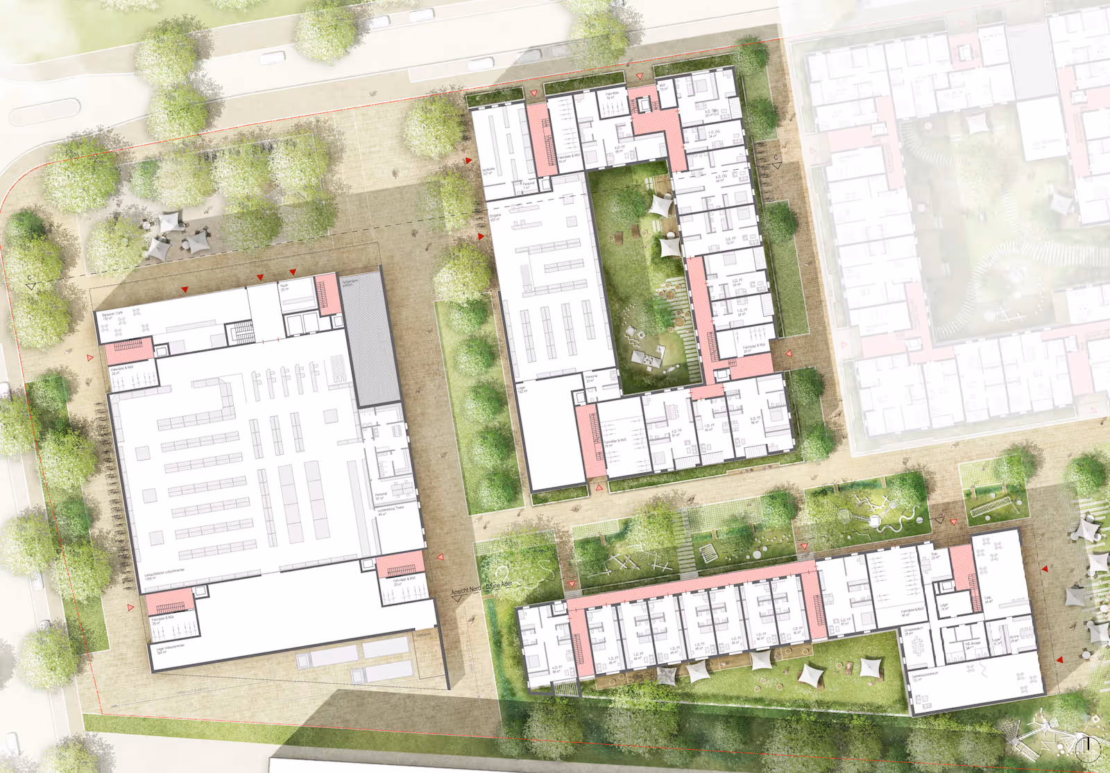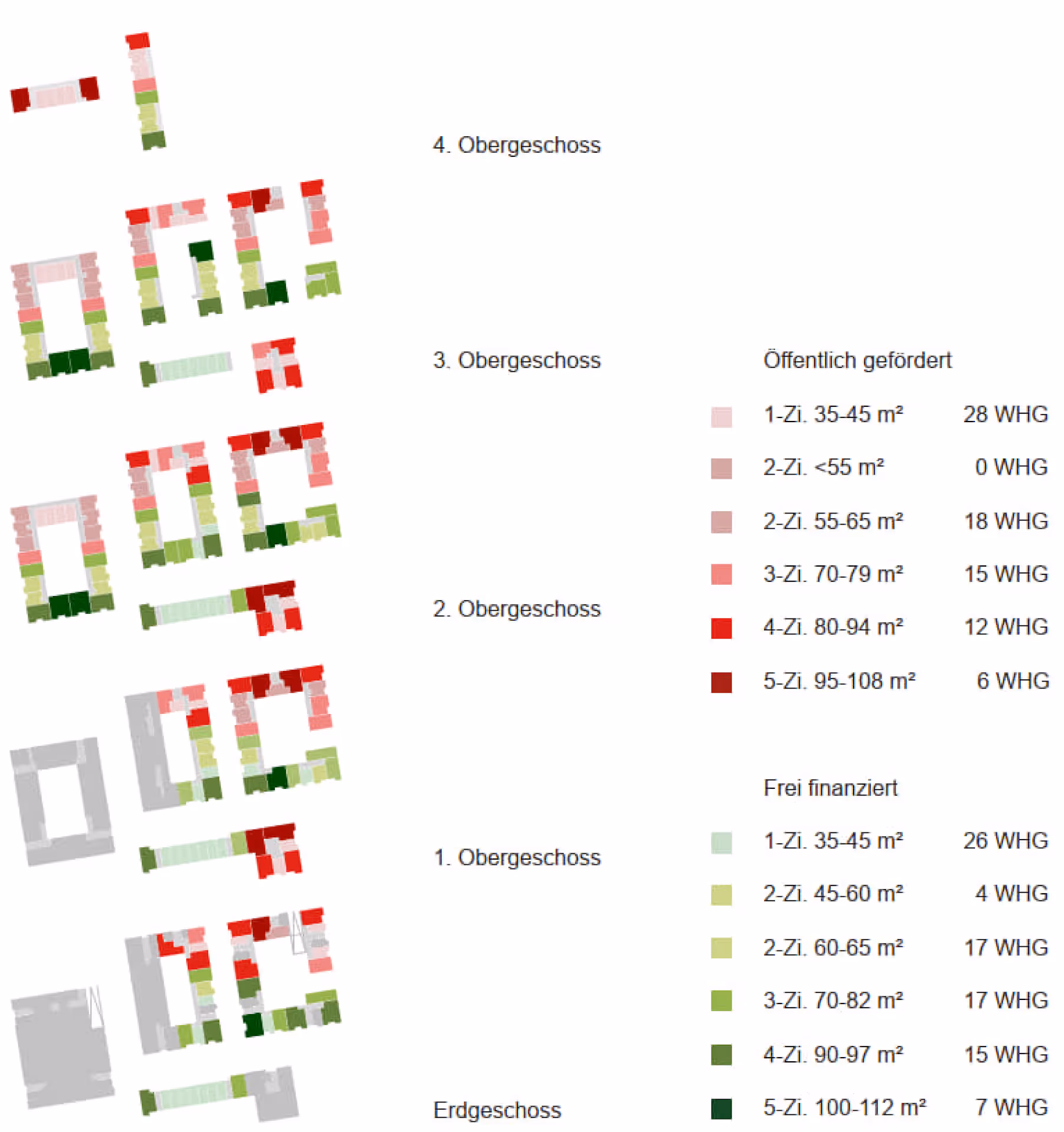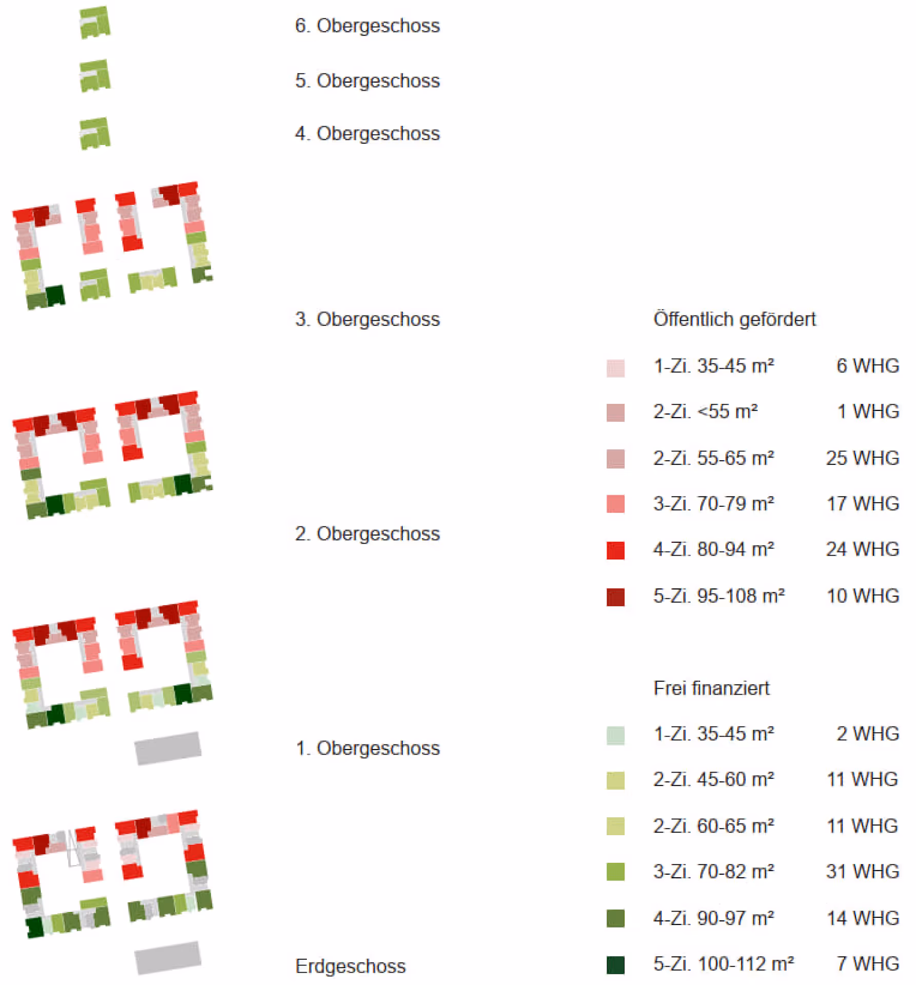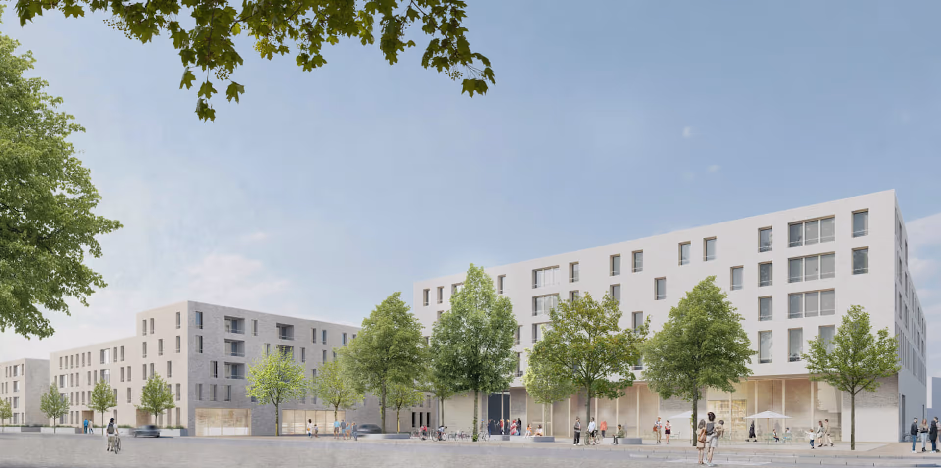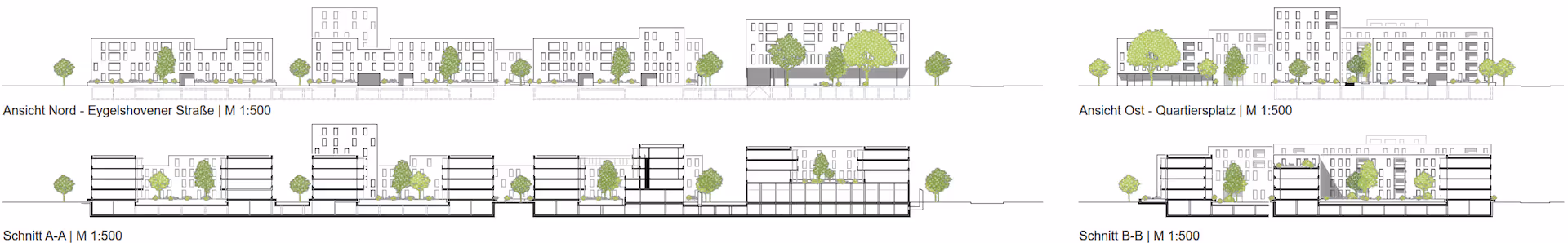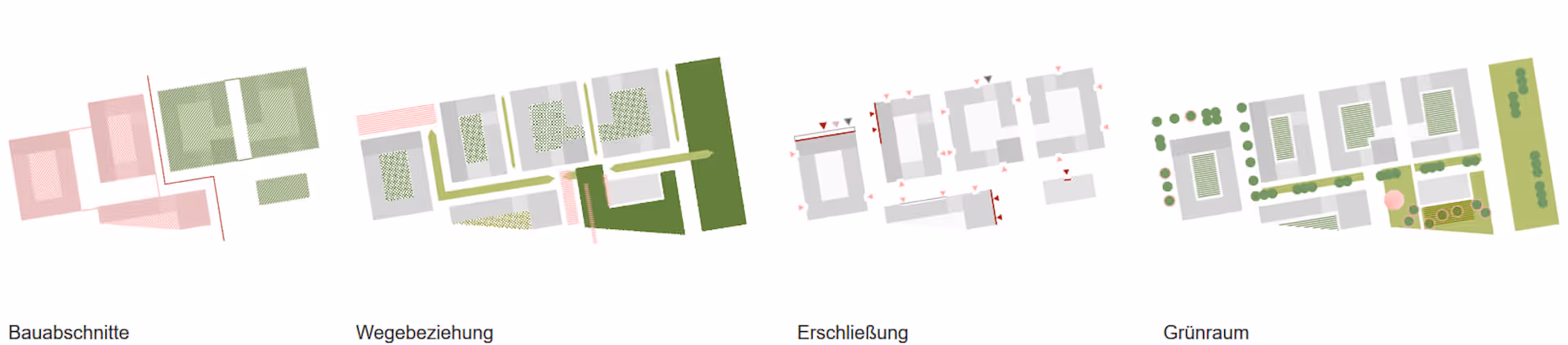 Eine Hauptachse durchzieht das Quartier mit einem grünen Band und verbindet das urbane Entrée mit dem multifunktionalen Quartiersplatz. Entlang der Quartiersachse gruppieren sich weitere Grün- und Spielflächen mit Aufenthalts- und Begegnungsfunktionen. Im Gegensatz zur klaren grünen Ader, fließt der begrünte Quartiersplatz förmlich in das Quartier und verzahnt sich mit den umliegenden Flächen. Die Innenhöfe der neuen Wohnbebauung bilden einen Kontrast zu der linearen Formsprache der Achsen. Das Hochbaukonzept zeichnet sich durch eine sehr kompakte Grundstruktur mit minimierten Verkehrs- und Erschließungsflächen aus. Jedes Haus erhält seine Adresse zum Straßenraum. Alle Gebäude sind barrierefrei und mit Anbindung an die Tiefgarage erschlossen. Das städtebauliche Konzept schafft ein attraktives Wohngebiet mit kleinteiligen Nachbarschaften. Die freiraumbezogene Gestaltung fördert die Gemeinschaft und Kommunikation zwischen den Bewohner*innen. Es wird ein hochwertiges Quartier mit vielfältigen städtebaulichen Situationen realisiert.