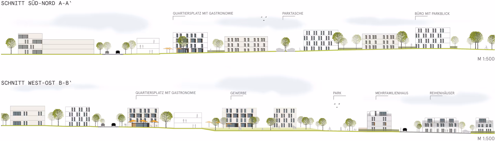 Ziel der Entwicklung am Freischützblick in Schwerte ist es, ein zukunftsorientiertes und lebenswertes Mischgebiet mit Wohn- und Gewerbetypologien zu schaffen. Die Leitidee des Entwurfs zielt auf eine bewusste Trennung des Areals in eine großflächig angelegte gewerbliche Nutzung im Westen und eine kleiner bemaßten Wohnnutzung im Osten ab. Dabei werden bestehende Nutzungen aufgegriffen und qualitativ ergänzt. Die breit angelegte Freiraumfläche dient dabei als trennendes Element, um die unterschiedlichen Raumansprüche miteinander zu vereinbaren.