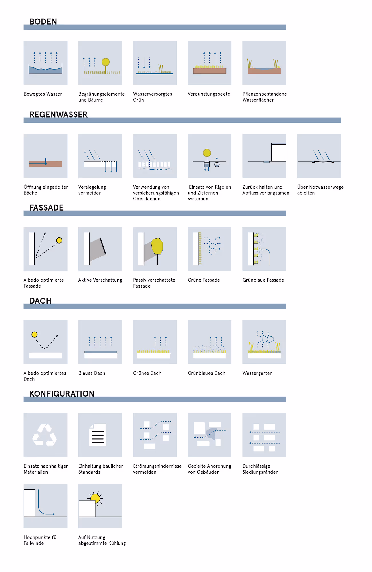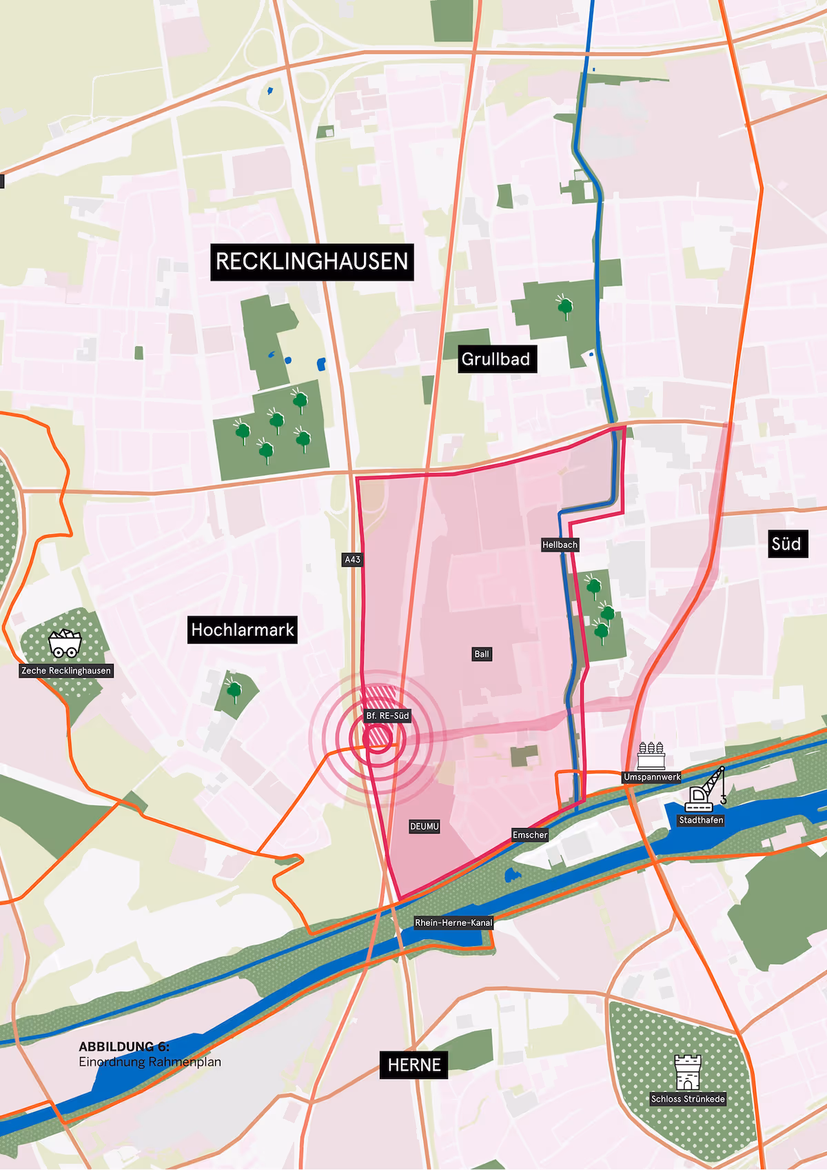 Darauf aufbauend werden in Form eines Kataloges Maßnahmen für verschiedene klimarelevante Themenbereiche erarbeitet. Die baulich-räumliche Studie fokussiert zuerst die baulichen Entwicklungsmöglichkeiten am Bahnhof Recklinghausen-Süd, um in einem weiteren Schritt die Möglichkeit der Integration der im Maßnahmenkatalog vorgeschlagenen Ansätze zu überprüfen. Hierzu werden Varianten entwickelt und ihre Potenziale zur Integration der Maßnahmen untersucht.