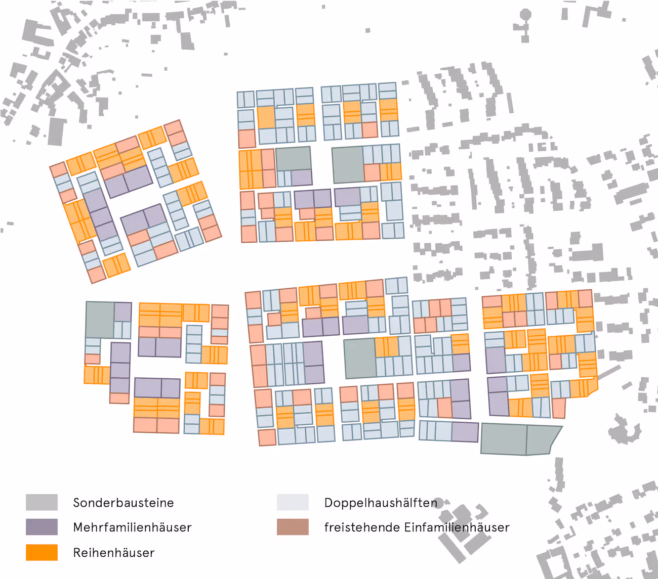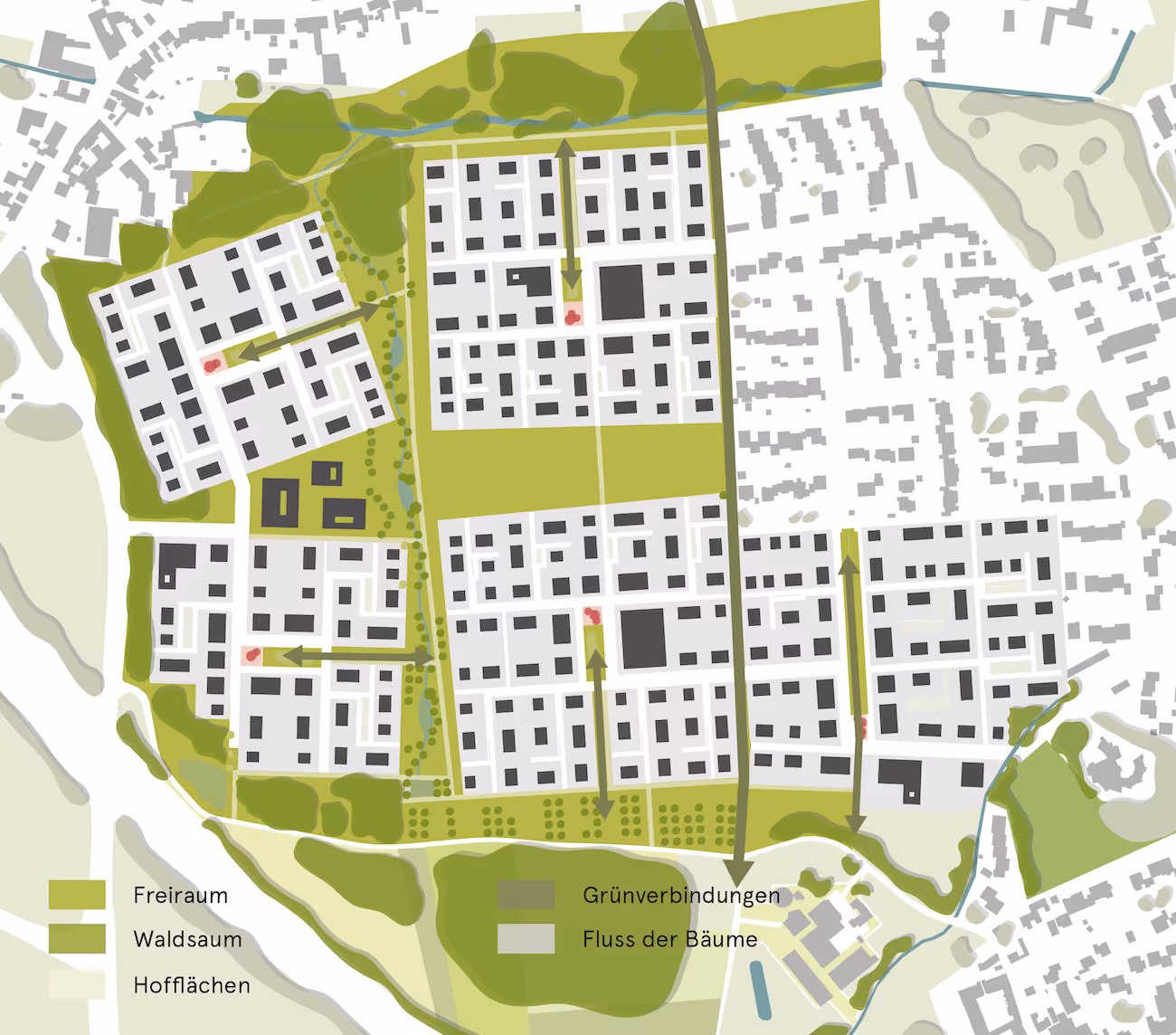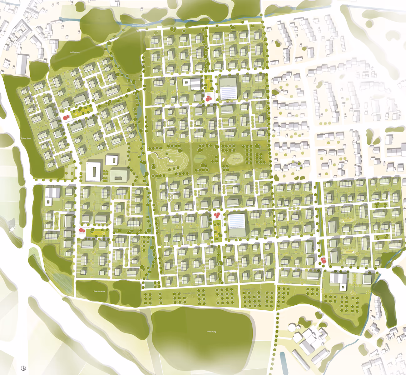 Stadt- und Freiraumverknüpfungen werden aufgegriffen und erfolgen über Wegebeziehungen, die Bestand und Neuplanung miteinander verbinden. Über die vielfältigen Freiraumqualitäten wird ein familienfreundlicher, naturbezogener Stadtteil geformt, der Gemeinschaft und Kommunikation fördert. Hierdurch entstehen hervorragende Voraussetzungen für eine hohe Wohn- und Lebensqualität.