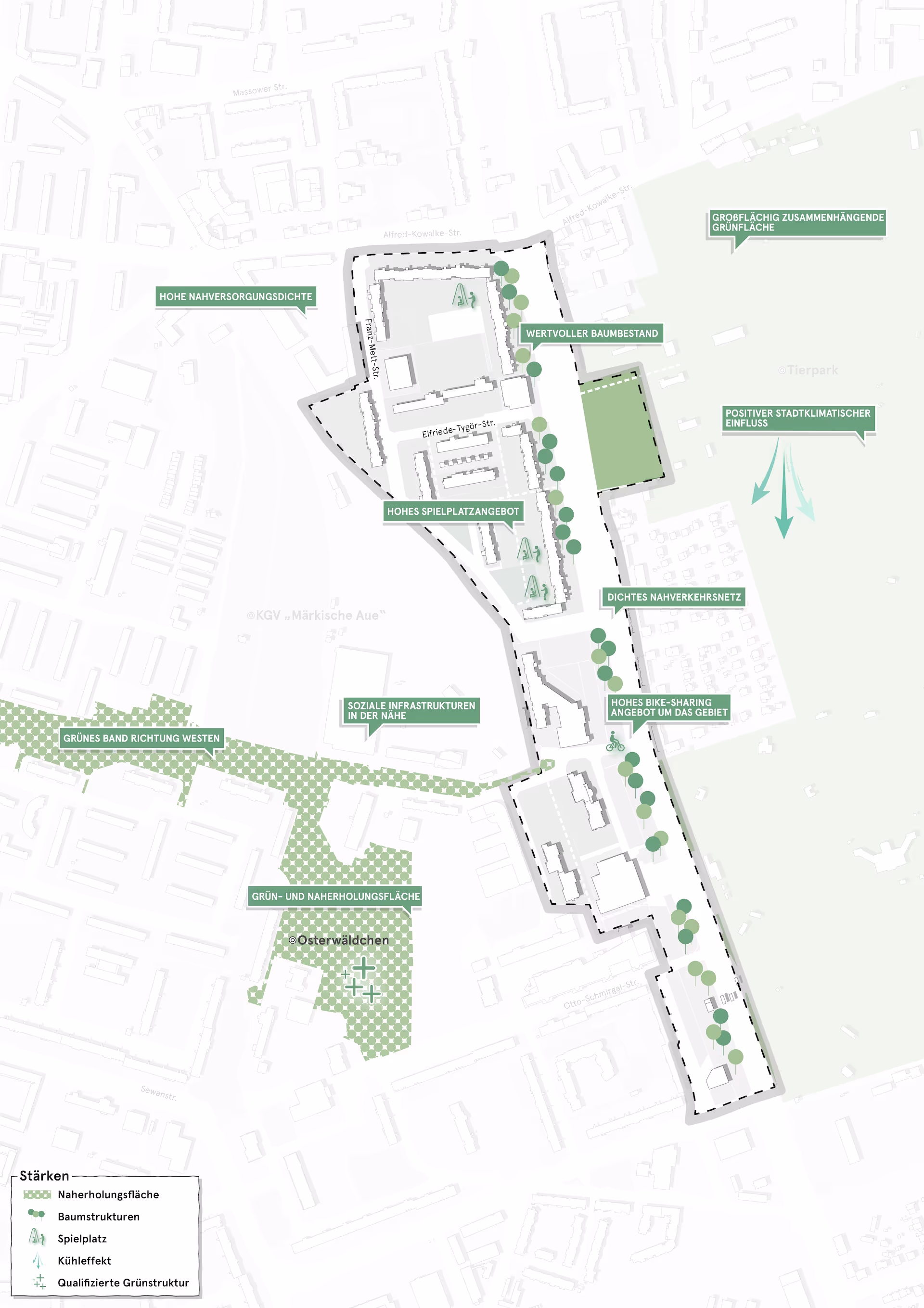 Der Untersuchungsraum erstreckt sich entlang der Straße „Am Tierpark“ und wird durch infrastrukturelle Großanlagen wie die U-Bahn-Betriebswerkstatt, den Tierpark Berlin und angrenzende Hauptverkehrsachsen geprägt. Das Konzept basiert auf einer umfassenden Bestandsanalyse, Ortsbegehungen und einem digitalen Planungsmodell und berücksichtigt vielfältige Fachperspektiven, u.a. über Beteiligung der Berliner Verkehrsbetriebe und bezirklicher Fachabteilungen.