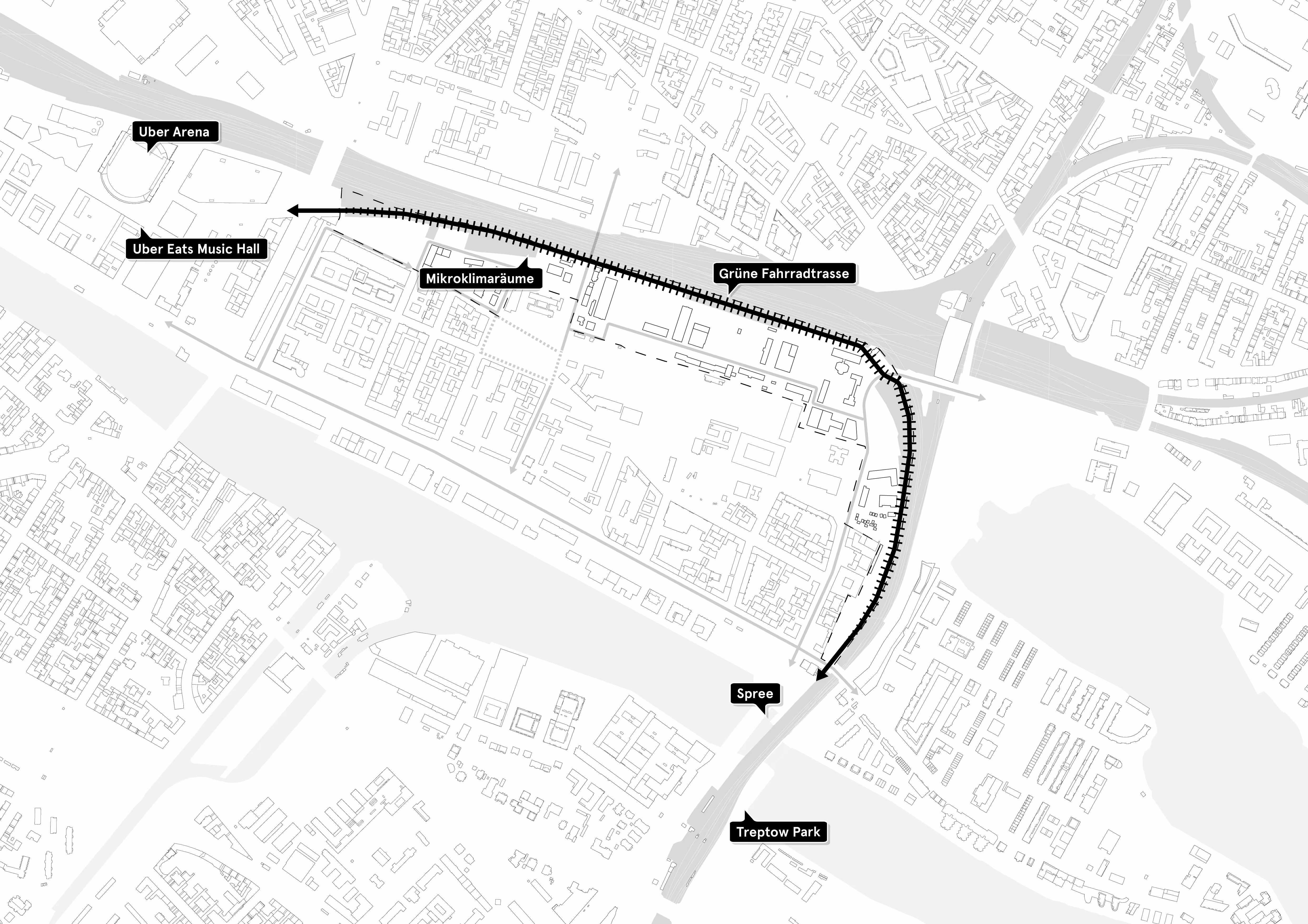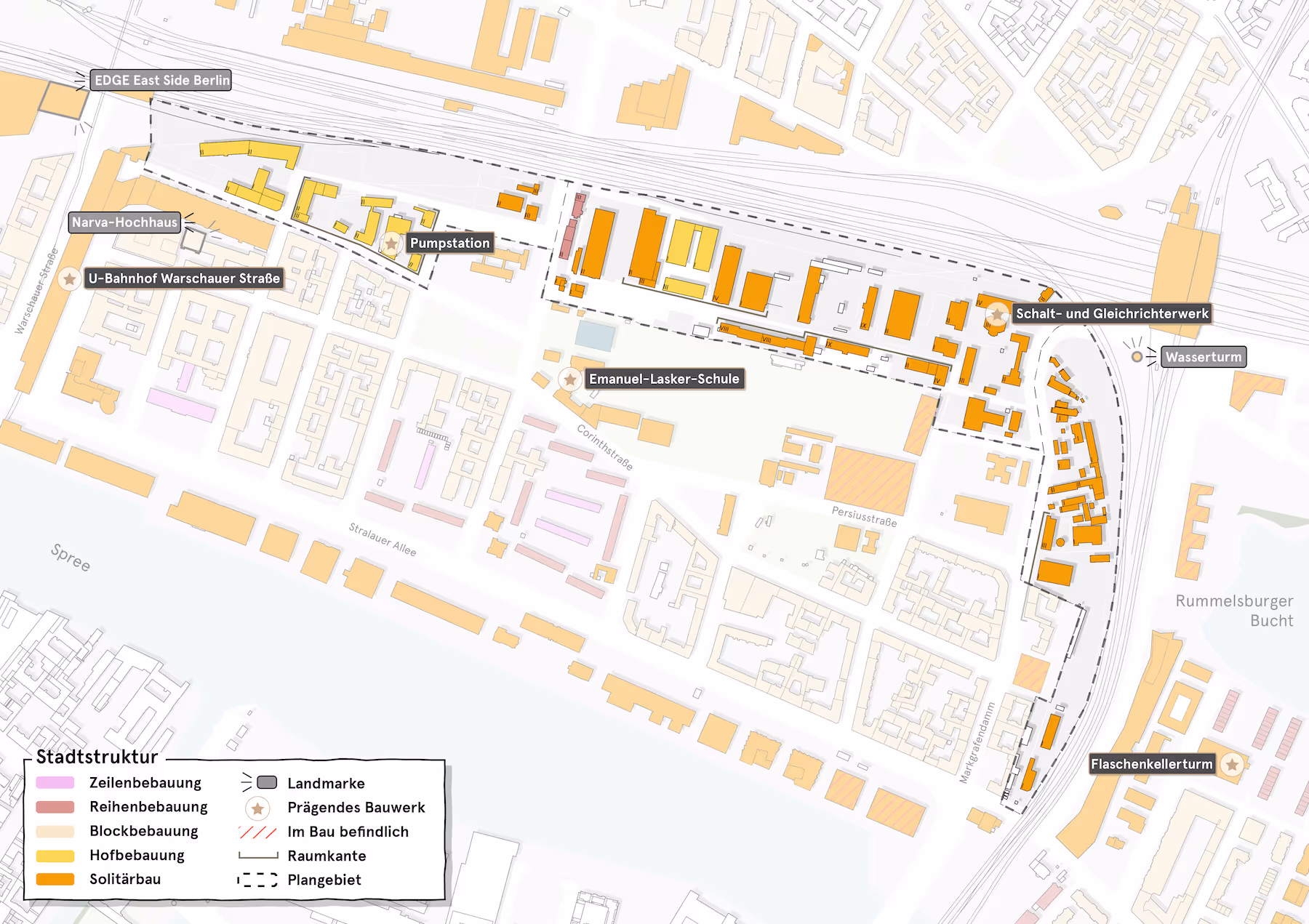 In unmittelbarer Nähe des Rudolfplatzes – zwischen S-Bahntrasse, Mediaspree und der geplanten A100-Verlängerung – trifft in Berlin ein typischer Zielkonflikt aufeinander: knapper werdender Raum, steigende Wohnraumnachfrage und der akute Erhaltungsdruck auf innerstädtische Gewerbeflächen. Für das Areal „Rudolfband“ im Bezirk Friedrichshain-Kreuzberg haben wir ein integriertes Entwicklungskonzept (IEK) erarbeitet, das die räumlich-funktionalen Entwicklungspotenziale des Gebiets aufzeigt und gleichzeitig eine Strategie für den Schutz und die Stärkung urbaner Produktions- und Kulturorte formuliert.