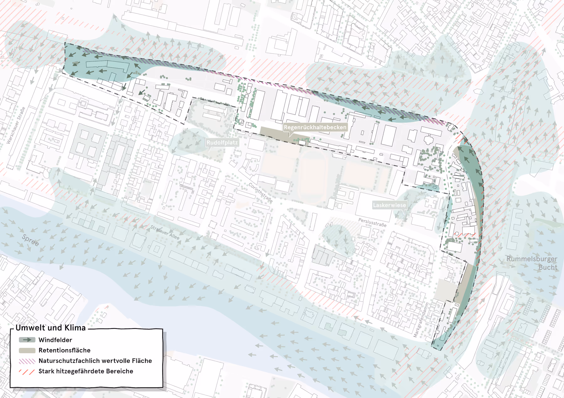 Die aktuelle Debatte um hochpreisige Wohnhochhaus-Projekte im Gebiet zeigt exemplarisch, welche Risiken mit punktuellen Einzelentwicklungen ohne übergeordneten planerischen Rahmen verbunden sind. Ohne eine konsistente und gemeinwohlorientierte Gesamtstrategie drohen Verdrängungseffekte und der Verlust vielfältiger urbaner Nutzungen. Das Integrierte Entwicklungskonzept Rudolfband stellt diesem Trend bewusst eine Alternative gegenüber: Es zeigt auf, wie urbane Räume nachhaltig, nutzungsgemischt und im Sinne des Gemeinwohls weiterentwickelt werden können – mit einem klaren Fokus auf den Erhalt und die Stärkung gewerblicher, kultureller und sozialer Infrastrukturen. So wird dem Risiko einer schleichenden Verdrängung produktiver Stadtfunktionen aktiv entgegengewirkt. Das IEK Rudolfband bietet damit eine strategische Grundlage für die künftige Entwicklung des Quartiers und dient als Referenz für nachhaltige und sozialverträgliche Stadtentwicklungsprozesse. Die enge Verzahnung mit bestehenden bezirklichen und gesamtstädtischen Konzepten gewährleistet eine kohärente Planung, die den Herausforderungen des Strukturwandels und der Flächenkonkurrenz in Friedrichshain-Kreuzberg gerecht wird. Das Rudolfband steht exemplarisch für eine Stadtentwicklung, die nicht nur auf dem Papier integriert ist, sondern im gelebten Alltag: produktiv, durchmischt, zukunftsfähig.