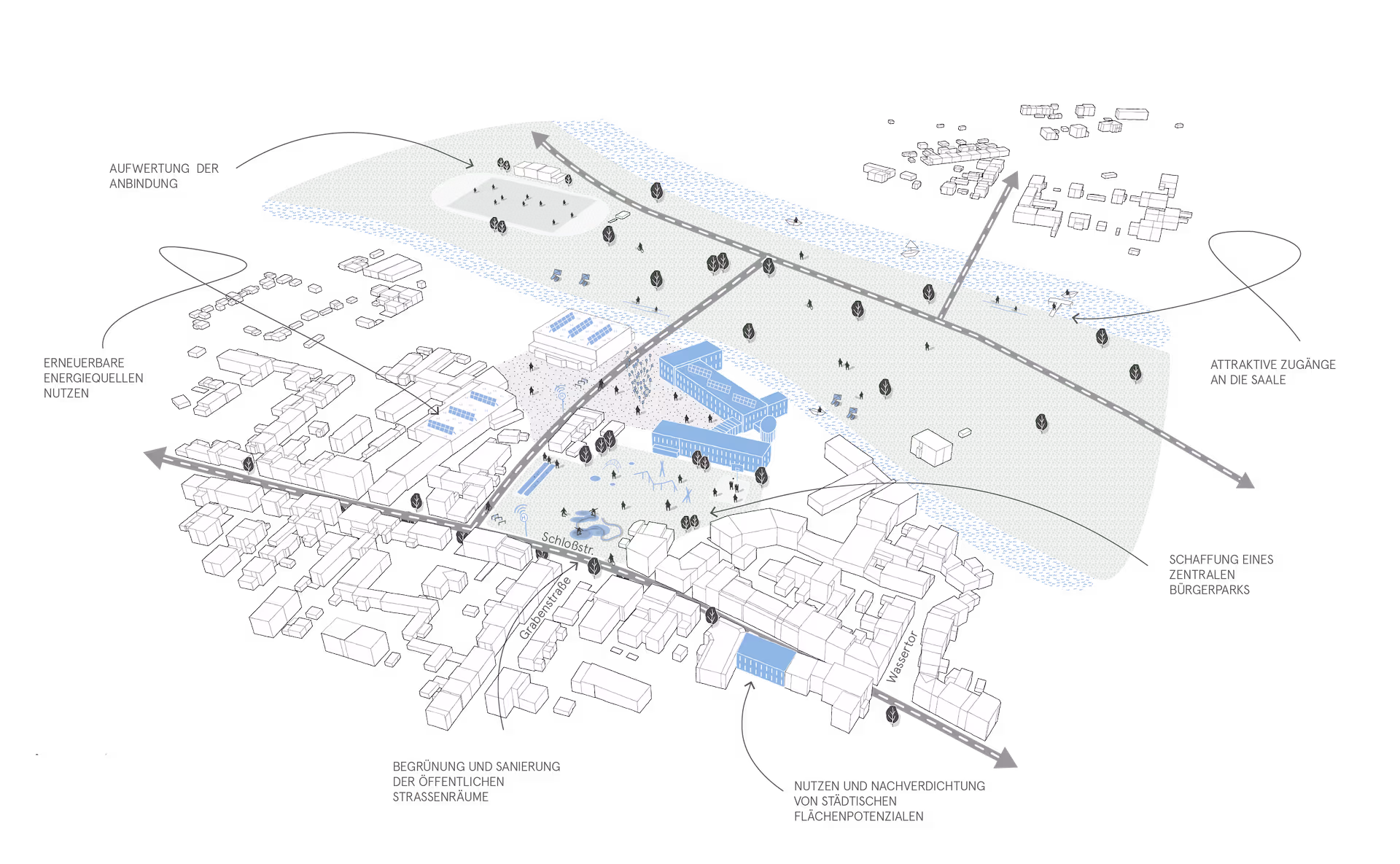 Das ISEK bietet die Möglichkeit, neue Herausforderungen und Aufgabenbereiche der Stadt ganzheitlich zu betrachten. Einzelmaßnahmen konnten in einen größeren Kontext gesetzt werden, um Informationen zu bündeln und somit Zielvorgaben für Verwaltung und Politik zu erarbeiten. Dadurch wurden Chancen zur weiteren Entwicklung Calbes aufgezeigt. In diesem Zusammenhang wurden wichtige Akteure in den Planungsprozess eingebunden und im Rahmen von Bürgerschaftsforen die Einwohner*innen Calbes an der Diskussion der Inhalte des ISEKs beteiligt. Aufbauend auf der Analyse der Grundlagen und einer umfassenden Bestandsaufnahme erfolgte im Rahmen einer SWOT-Analyse die Untersuchung vorhandener Stärken und Schwächen sowie Chancen und Risiken für die weitere Entwicklung Calbes. Im zweiten Arbeitsschritt wurde ein Ziel- und Maßnahmenkonzept formuliert, das die Ideen und Wünsche aus Bürgerschaft, Verwaltung, Politik und den sektoralen Planungen in konkrete Handlungsmaßnahmen überführt. Um dieses Konzept in der Zukunft sortiert und strukturiert angehen zu können, beinhaltet das ISEK einen Strategieplan, der die Konzentration auf die Kernaufgabe vorsieht und benennt Fokusräume, welche stadträumliche Schwerpunkte setzen. So entstand ein umfangreiches Entwicklungskonzept, das den zukünftigen Entwicklungspfad der Stadt Calbe (Saale) bis ins Jahr 2040 leitet.