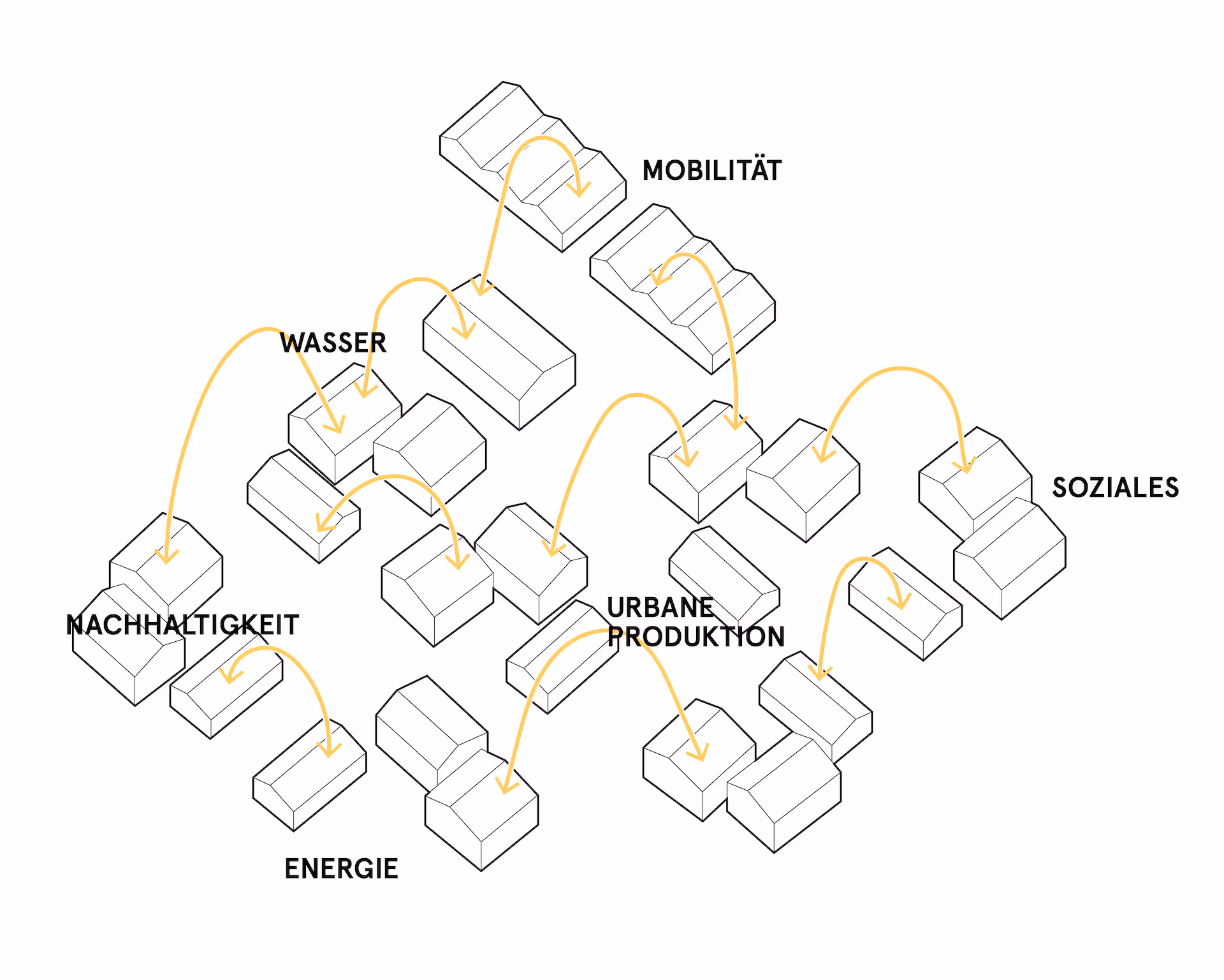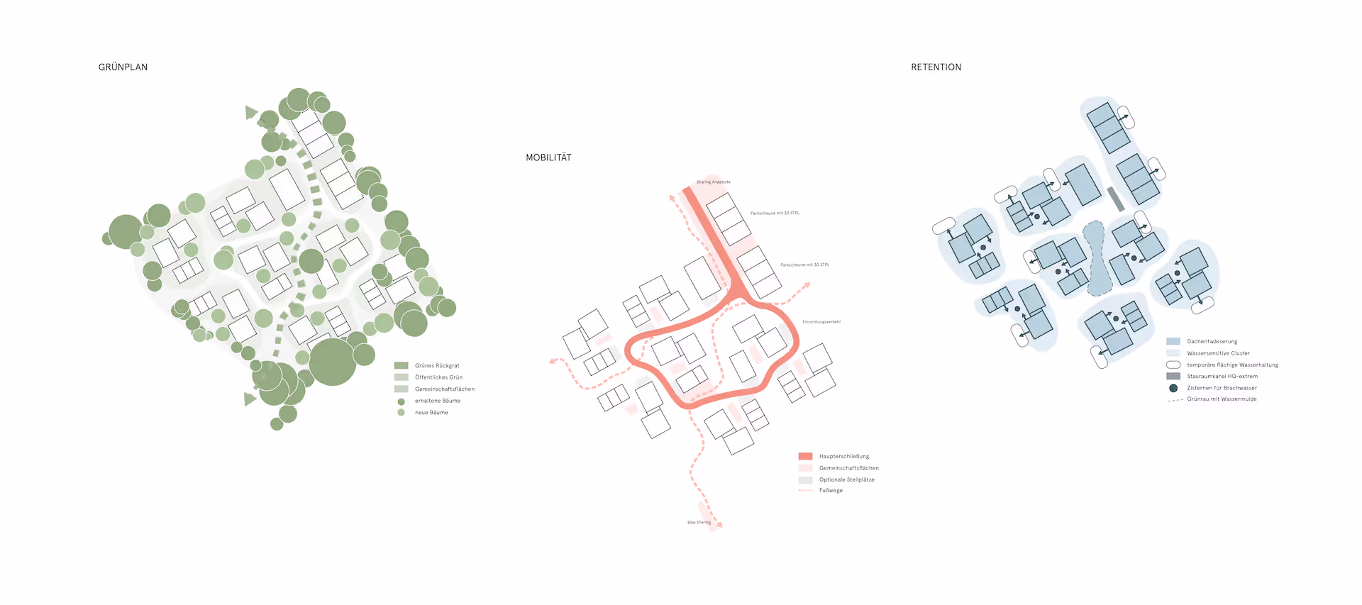 Unser Vorschlag einer Klimasiedlung entwickelt sich aus den vorhandenen Qualitäten des Geländes und berücksichtigt dabei respektvoll die Lage des Gebietes am Rand zu Siedlung und Ruhestätten. Das Quartier respektiert den lokalen Maßstab mit einer sorgfältig gestalteten Höhenentwicklung und einer proportionalen Dimensionierung der Wohngebäude gegenüber den Einfamilienhäusern im Norden und den Mehrfamilienhäusern im Westen. Die naturorientierte Anmutung des Quartiers trägt eine klare Handschrift und lässt an der Wiescherstraße Hernes „Smartes Klimaquartier“ entstehen. Ziel ist es, ein grünes Nullenergie-Quartier mit smarter Technologie, als einen sozialen Ankerpunkt für die Nachbarschaft zu schaffen. Das Konzept schafft familienfreundliche, freiraumbezogene Wohncluster, welche über eine hohe Qualität verfügen und Identität, Gemeinschaft und Kommunikation fördern. So wird ein hochwertiges und attraktives Wohnbaugebiet mit vielfältigen, lebenswerten Situationen realisiert. Eine enge Verbindung von Freiraum und Wohnraum ist eine Priorität des Entwurfs. Im Entwurf werden nahezu alle Bäume auf der Fläche erhalten und die Siedlung um den wertvollen Baumbestand herum entwickelt. Die entstehende ausdifferenzierte Quartierslandschaft erzeugt unterschiedliche ökologische Nischen für verschiedene Tier- und Pflanzenarten. Gemeinschaftsgebäude und deren offene Erdgeschosse schaffen eine lebendige Verbindung zwischen Innen und Außen. Die Anschlüsse der Gemeinschaftsgebäude an den Außenbereich ermöglichen es, dass gemeinschaftliche Funktionen in den Freiraum dringen. Der nach Süden ausgerichtete öffentliche Platzraum des Gemeinschaftshauses ermöglicht eine Aktivierung des Freiraums um das Gebäude herum. Der Quartiersplatz ist damit gleichermaßen Treffpunkt der Nachbarschaft und Anker für das Quartier.