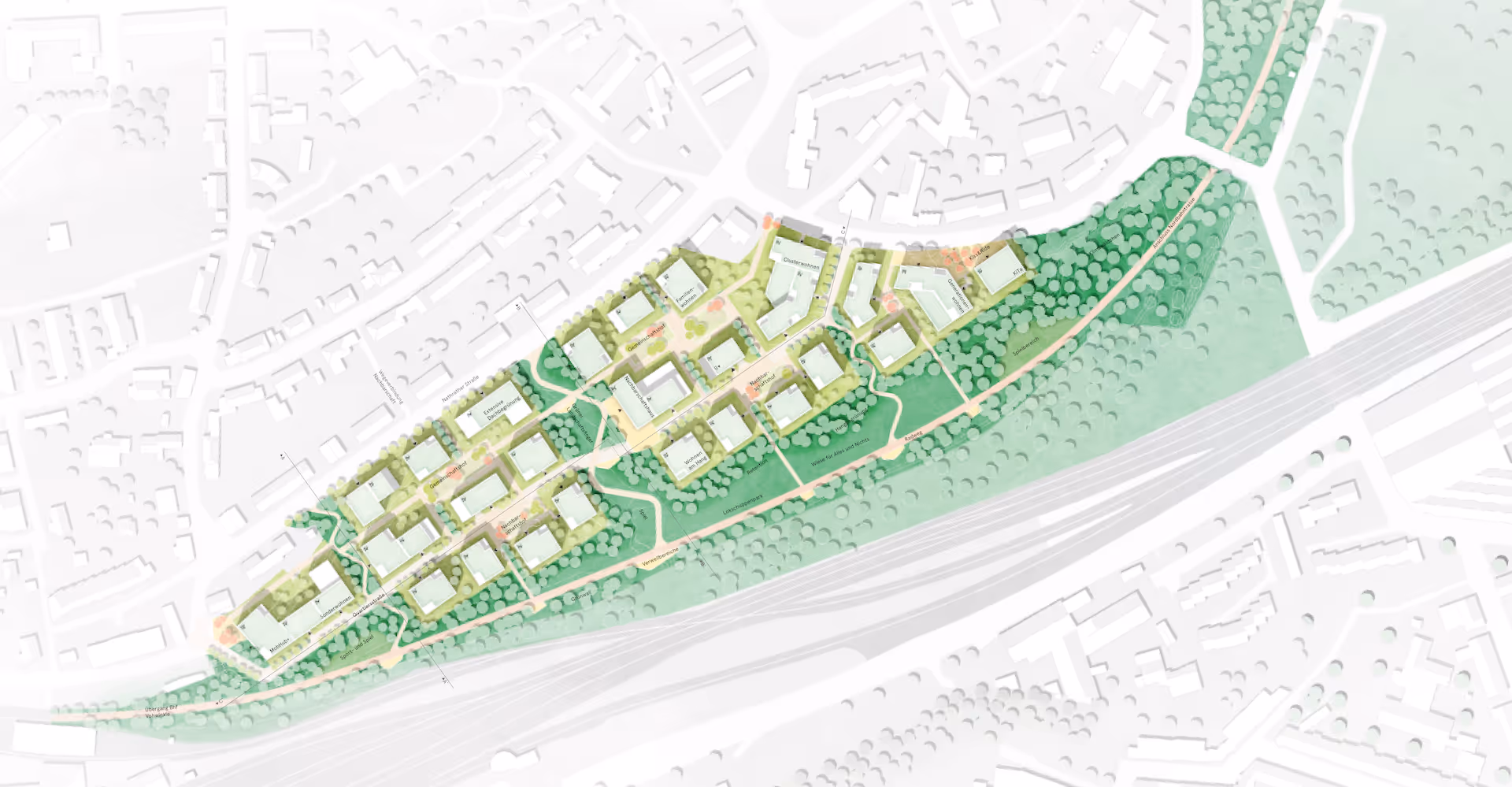 Unser Konzept zielt darauf ab, die umgebenden Strukturen sinnvoll zu ergänzen und miteinander zu verbinden, so dass ein harmonisches Gesamtgefüge entsteht, das die charakteristischen Merkmale der Umgebung aufgreift und weiterentwickelt. Eine besondere Herausforderung stellen dabei topografische Unterschiede dar. Die Gebäudeensemble des Quartiers sind behutsam in die ansteigende Hanglage eingebettet, wobei sie sich in ihrer Körnigkeit an der umgebenden Bebauung orientieren. Die Vielfalt der Gebäudetypen und die lebendige Gestaltung der Dachlandschaften unterstreichen die besondere Topographie des Ortes. Dabei wird die vorhandene Bebauung aufgenommen, aber durch eine klare und durchdachte Orientierung der Blockränder in den spezifischen topographischen Gegebenheiten der Umgebung neu interpretiert. Durch die Gliederung in kleinen Wohnhofsituationen entsteht eine familienfreundliche und freiraumbezogene Nachbarschaft mit hoher Identität, Qualität und Gemeinschaft auf mehreren Terrassen. Dabei werden verschiedene Wohnformen für unterschiedliche Nutzer*innengruppen angeboten. Hierbei wird ein ressourcenschonendes Klimaquartier angestrebt. Insgesamt steht das Miteinander im Vordergrund.