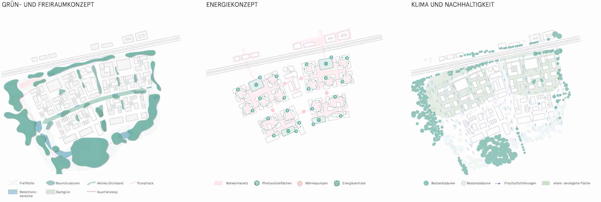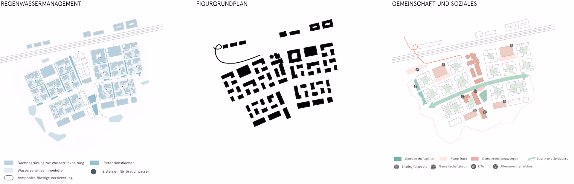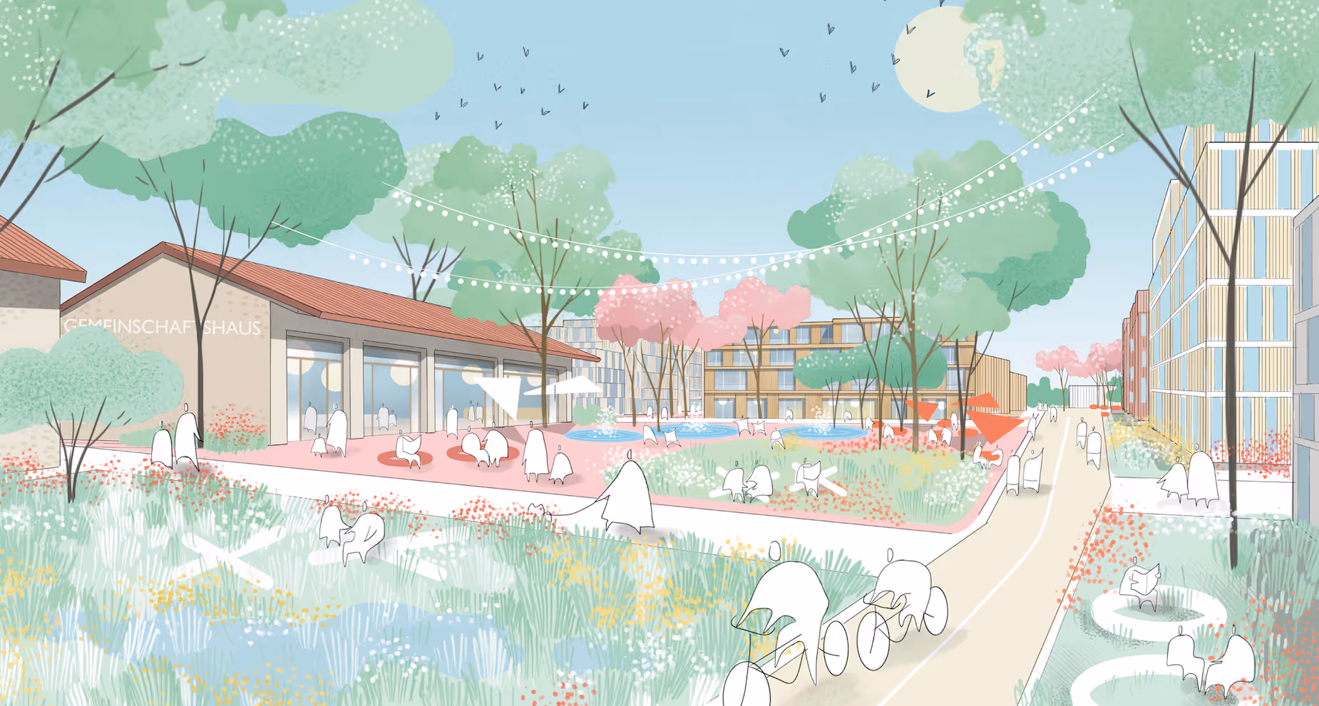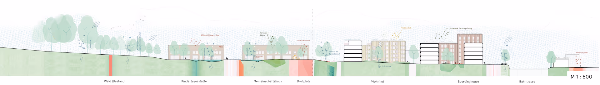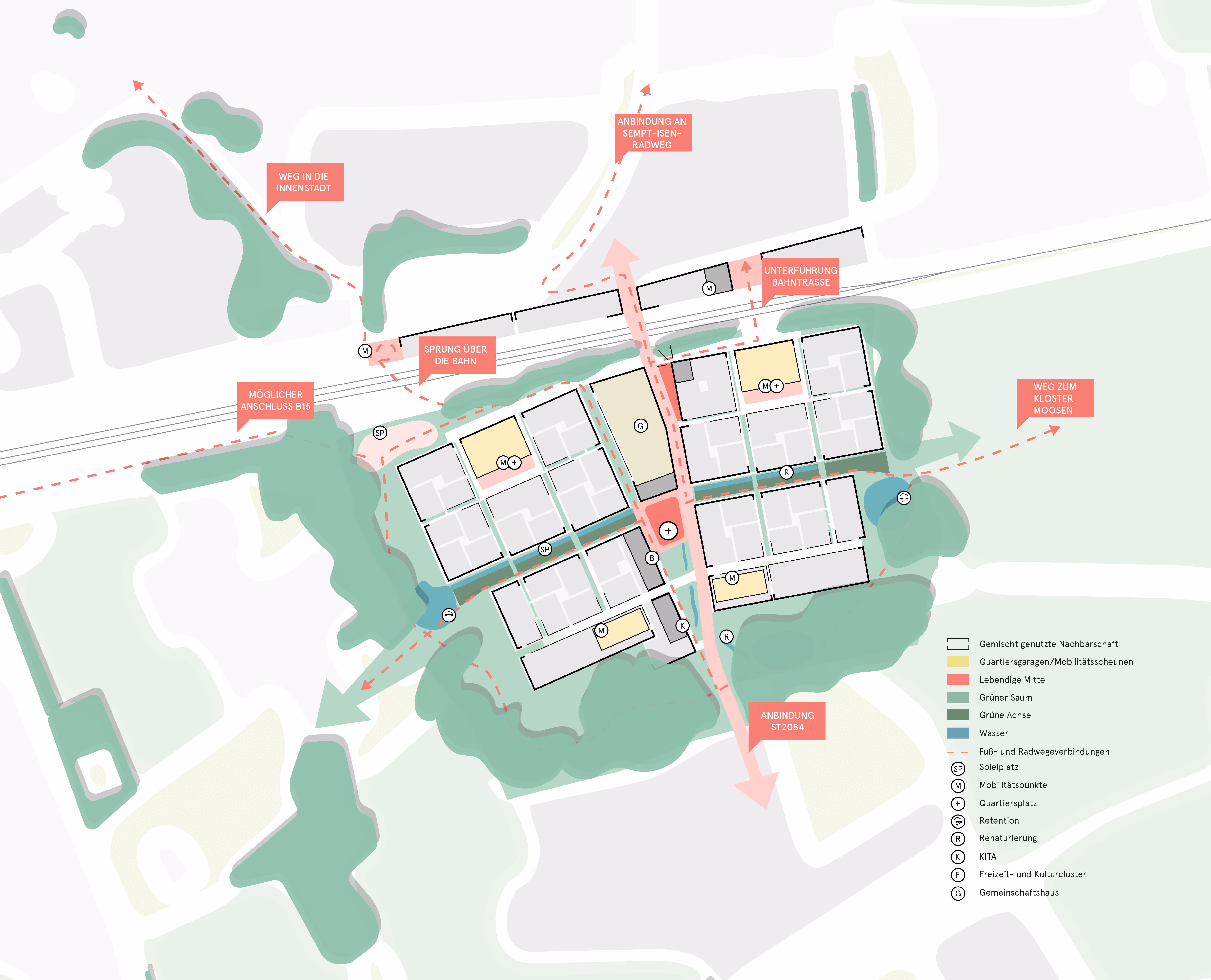 Durch die Kombination von kompakten, aber differenzierten Wohnblöcken mit sozialen Einrichtungen und Quartiersgaragen entstehen vier durch Freiräume verbundene Quartiere mit individuellem Charakter und Naturbezug. Durch die Anordnung der lebendigen Quartiere entsteht eine Freiraumachse, die über Wegeverbindungen von jedem Quartier aus erreichbar ist. Die Wohnblöcke verbinden unterschiedliche Wohnformen und bieten ein sozial gemischtes Wohnangebot für alle Lebensphasen. Eine Besonderheit der Quartiere ist die neue Kontextualisierung der bestehenden Gebäude und ihrer Materialien. Die bestehenden Holzhäuser werden im Plangebiet neu errichtet und bilden am geplanten Standort einen Übergang zum südlich an das Plangebiet angrenzenden Waldband, dem „Grünen Saum“. Darüber hinaus werden vorhandene Materialien für die Errichtung neuer Stadtbausteine wiederverwendet und recycelt. An den zentralen Quartiersplatz schließen sich die Kindertagesstätte und der Nachbarschaftstreff an. Beide Nutzungen sind im Moorhaus untergebracht, das durch seine Umnutzung neu inszeniert wird und zusammen mit dem begrünten Quartiersplatz das Herzstück des neuen Stadtteils bildet. Im Zentrum des neuen Quartiers entsteht eine lebendige Gemeinschaftsachse - der Dorfboulevard.