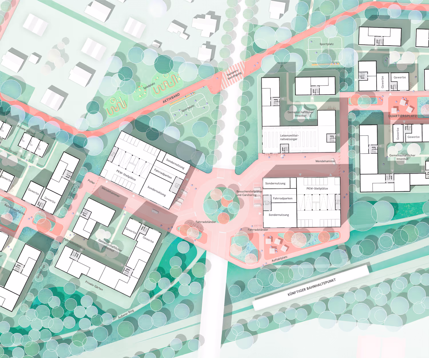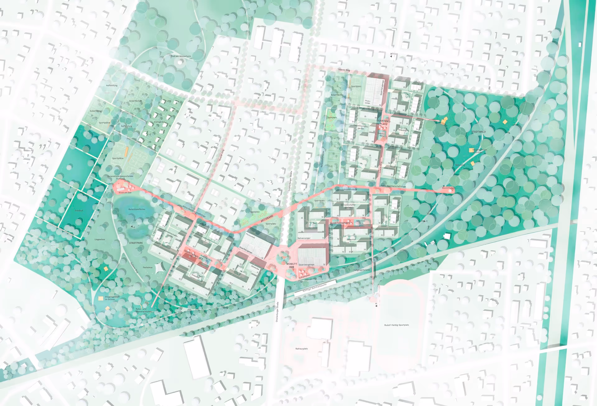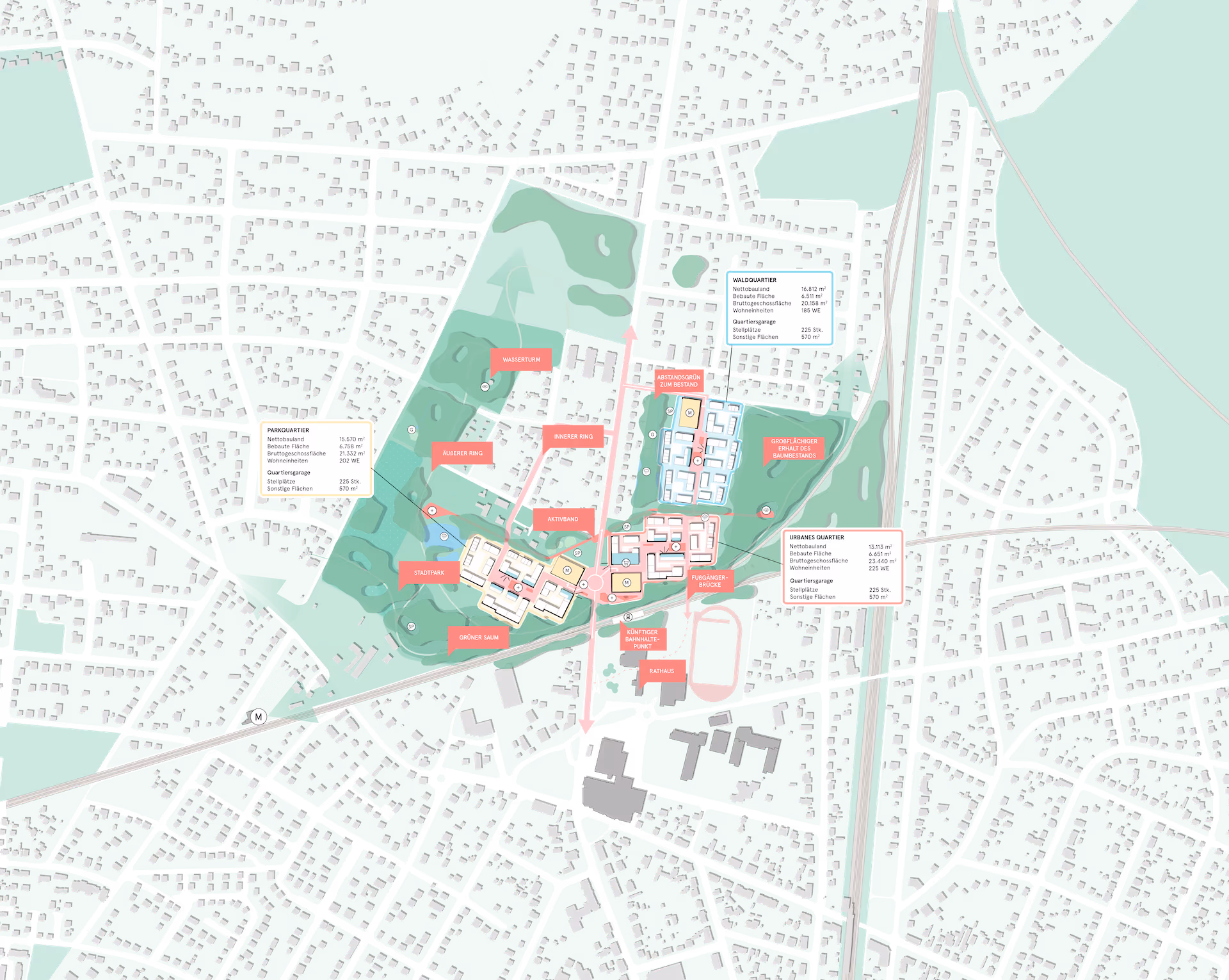 Auf dem Areal entlang der Oranienburger Straße in Hohen Neuendorf entsteht ein neues Wohnquartier, das sich in die vorhandene kleinteilige städtebauliche Situation einfügt und den Bedarf an Wohnraum in angemessener Dichte deckt. Die Leitidee des neuen Quartiers basiert auf der Schaffung eines lebendigen und sozial gemischten Stadtquartiers, in dem unterschiedliche Wohnformen im Vordergrund stehen. Als besondere Qualität des Wohnstandortes werden die vorhandenen Frei- und Erholungsräume aufgegriffen und weiterentwickelt. Durch die Kombination von kompakten, differenziert gestalteten Wohnblöcken mit Gewerbe- und Gemeinschaftseinrichtungen sowie Quartiersgaragen entstehen drei durch Freiräume verbundene Quartiere: das Waldquartier, das Urbane Quartier und das Parkquartier. Die Wohnblöcke kombinieren unterschiedliche Gebäudetypologien und Wohnformen und bieten ein sozial gemischtes Wohnungsangebot. Gewerbliche Nutzungen entlang der Oranienburger Straße und an den Quartiersplätzen ergänzen das Angebot im Quartier. Die vorhandenen Freiflächen und Baumbestände können durch die dichte Bebauung erhalten bleiben und qualifizieren das Gebiet. Das Aktivband verbindet die Quartiere über eine Fuß- und Radwegeverbindung und bündelt verschiedene aktive Nutzungen wie Sportflächen, eine Aussichtsplattform, Aufenthaltsbereiche und Naherholungsflächen. Um das Quartier herum entsteht ein äußerer Ring, der das Quartier mit dem übergeordneten Freiraum verbindet. Die neuen Quartiere sind in ein hochwertiges Grün- und Freiraumsystem eingebettet. Jedes Quartier gruppiert sich um einen Quartiersplatz, der als sozialer und kommunikativer Treffpunkt dient. Die Hofgruppen der Gebäude orientieren sich jeweils zu einem gemeinsamen begrünten Innenhof, der als Wohnhof mit gemeinschaftlich genutzten Freiraumangeboten wie Gemeinschaftsgärten gestaltet ist. Das neue Stadtquartier wird über zwei Anbindungen an die Oranienburger Straße erschlossen. Die Erschließungsflächen bilden einen inneren Ring und sind weitgehend autofrei konzipiert. Die Positionierung der drei zentralen Quartiersgaragen an den jeweiligen Quartierseingängen ermöglicht eine direkte Abwicklung des Verkehrs, hält das gesamte Quartier frei von privaten Pkw. Die quartiersinterne Mobilität konzentriert sich auf den Fuß- und Radverkehr und setzt auf das Prinzip der kurzen Wege zur Mobilitätsvermeidung. Darüber hinaus erschließen überörtliche Fuß- und Radwege im Grünen Netz die Quartiere und binden sie über nachhaltige Mobilitätsformen an die Gesamtstadt an. Der neue Stadtteil ist als resilientes Quartier an zukünftige klimatische Bedingungen angepasst und verfolgt hohe Nachhaltigkeitsziele zum Klimaschutz. Der Erhalt der vorhandenen hochwertigen Freiflächen mit Baumbestand bei gleichzeitiger Schaffung von ausreichend Wohnraum ist ein wesentliches Merkmal des Entwurfs. Dach- und Fassadenbegrünung sorgen für eine natürliche Kühlfunktion und speichern Regenwasser zwischen. Darüber hinaus werden die Dächer zur Energiegewinnung durch Photovoltaikanlagen genutzt. Die Regenwasserbewirtschaftung wird in Form von Mulden und offenen Rinnen als erlebbare Gestaltungselemente in die Frei- und Straßenräume integriert. Dies ermöglicht die Zwischenspeicherung von Wasser und schützt die Bebauung bei Starkregenereignissen. In den Wohnhöfen wird das Regenwasser in Zisternen gesammelt und kann so als Brauchwasser oder zur Bewässerung der Grünflächen wiederverwendet werden.