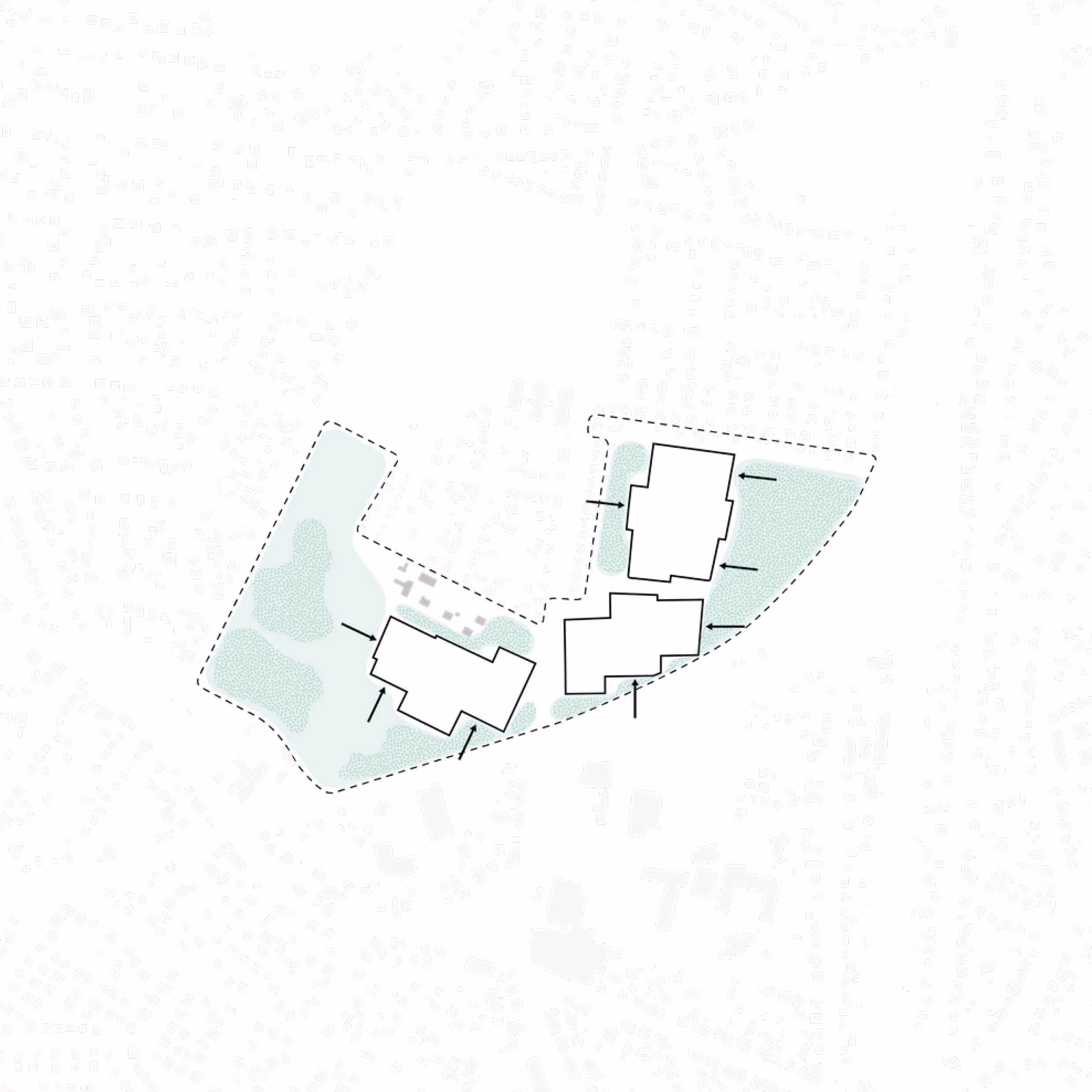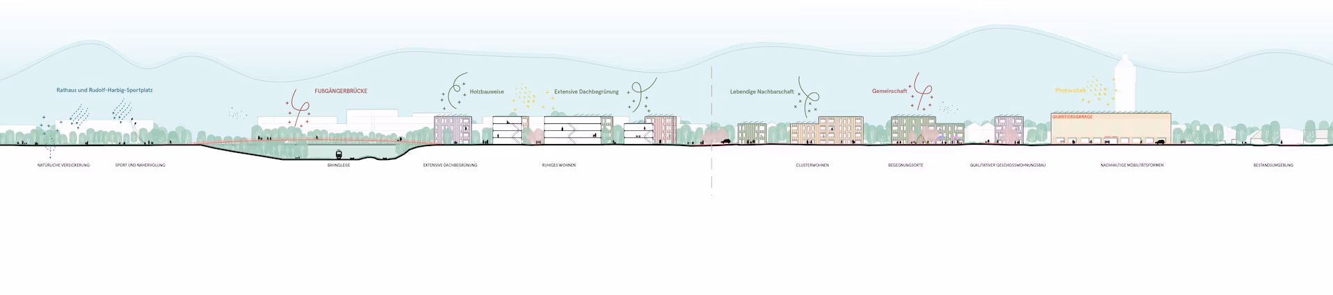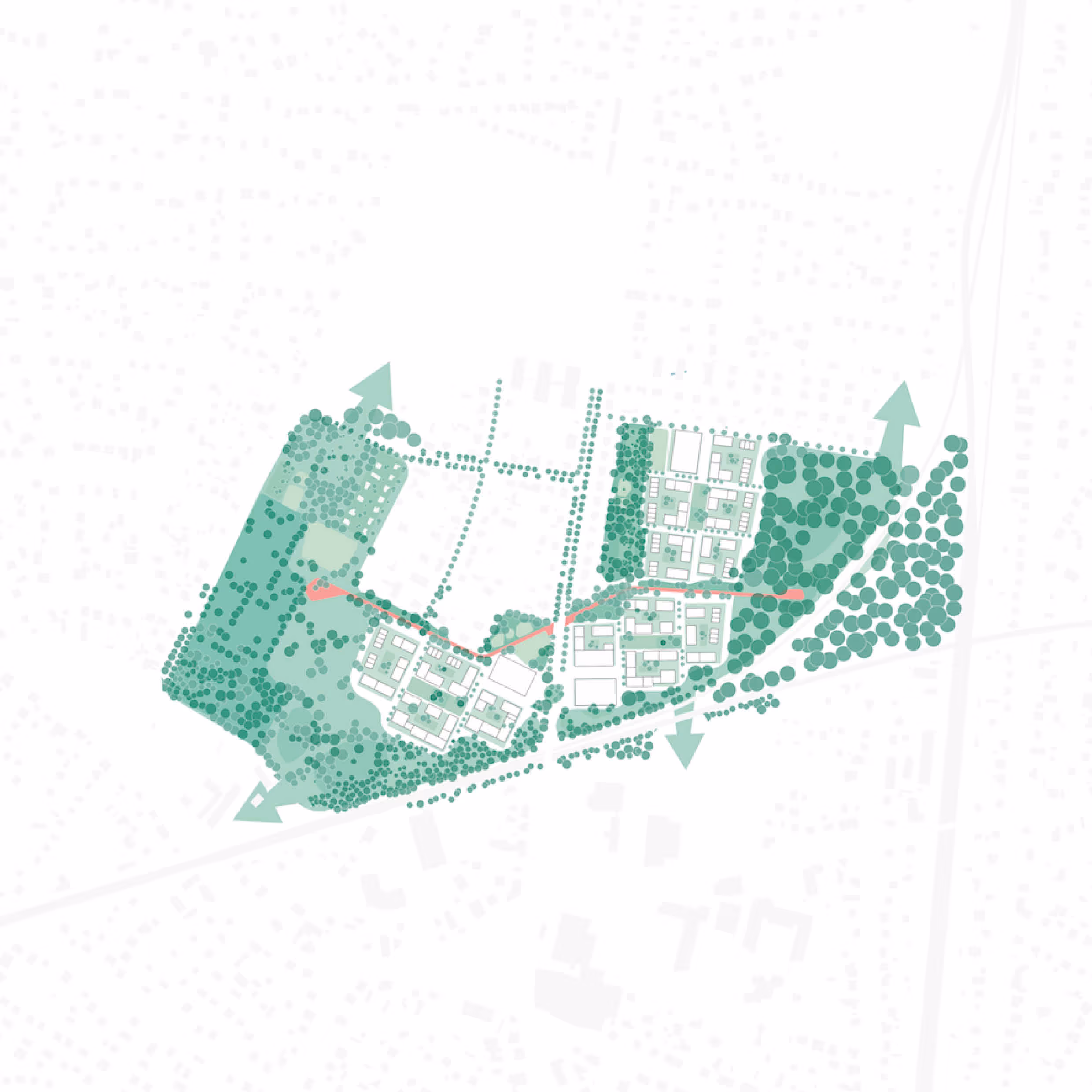 Auf dem Areal entlang der Oranienburger Straße in Hohen Neuendorf entsteht ein neues Wohnquartier, das sich in die vorhandene kleinteilige städtebauliche Situation einfügt und den Bedarf an Wohnraum in angemessener Dichte deckt. Die Leitidee des neuen Quartiers basiert auf der Schaffung eines lebendigen und sozial gemischten Stadtquartiers, in dem unterschiedliche Wohnformen im Vordergrund stehen. Als besondere Qualität des Wohnstandortes werden die vorhandenen Frei- und Erholungsräume aufgegriffen und weiterentwickelt. Durch die Kombination von kompakten, differenziert gestalteten Wohnblöcken mit Gewerbe- und Gemeinschaftseinrichtungen sowie Quartiersgaragen entstehen drei durch Freiräume verbundene Quartiere: das Waldquartier, das Urbane Quartier und das Parkquartier. Die Wohnblöcke kombinieren unterschiedliche Gebäudetypologien und Wohnformen und bieten ein sozial gemischtes Wohnungsangebot. Gewerbliche Nutzungen entlang der Oranienburger Straße und an den Quartiersplätzen ergänzen das Angebot im Quartier. Die vorhandenen Freiflächen und Baumbestände können durch die dichte Bebauung erhalten bleiben und qualifizieren das Gebiet. Das Aktivband verbindet die Quartiere über eine Fuß- und Radwegeverbindung und bündelt verschiedene aktive Nutzungen wie Sportflächen, eine Aussichtsplattform, Aufenthaltsbereiche und Naherholungsflächen. Um das Quartier herum entsteht ein äußerer Ring, der das Quartier mit dem übergeordneten Freiraum verbindet. Die neuen Quartiere sind in ein hochwertiges Grün- und Freiraumsystem eingebettet. Jedes Quartier gruppiert sich um einen Quartiersplatz, der als sozialer und kommunikativer Treffpunkt dient. Die Hofgruppen der Gebäude orientieren sich jeweils zu einem gemeinsamen begrünten Innenhof, der als Wohnhof mit gemeinschaftlich genutzten Freiraumangeboten wie Gemeinschaftsgärten gestaltet ist. Das neue Stadtquartier wird über zwei Anbindungen an die Oranienburger Straße erschlossen. Die Erschließungsflächen bilden einen inneren Ring und sind weitgehend autofrei konzipiert. Die Positionierung der drei zentralen Quartiersgaragen an den jeweiligen Quartierseingängen ermöglicht eine direkte Abwicklung des Verkehrs, hält das gesamte Quartier frei von privaten Pkw. Die quartiersinterne Mobilität konzentriert sich auf den Fuß- und Radverkehr und setzt auf das Prinzip der kurzen Wege zur Mobilitätsvermeidung. Darüber hinaus erschließen überörtliche Fuß- und Radwege im Grünen Netz die Quartiere und binden sie über nachhaltige Mobilitätsformen an die Gesamtstadt an. Der neue Stadtteil ist als resilientes Quartier an zukünftige klimatische Bedingungen angepasst und verfolgt hohe Nachhaltigkeitsziele zum Klimaschutz. Der Erhalt der vorhandenen hochwertigen Freiflächen mit Baumbestand bei gleichzeitiger Schaffung von ausreichend Wohnraum ist ein wesentliches Merkmal des Entwurfs. Dach- und Fassadenbegrünung sorgen für eine natürliche Kühlfunktion und speichern Regenwasser zwischen. Darüber hinaus werden die Dächer zur Energiegewinnung durch Photovoltaikanlagen genutzt. Die Regenwasserbewirtschaftung wird in Form von Mulden und offenen Rinnen als erlebbare Gestaltungselemente in die Frei- und Straßenräume integriert. Dies ermöglicht die Zwischenspeicherung von Wasser und schützt die Bebauung bei Starkregenereignissen. In den Wohnhöfen wird das Regenwasser in Zisternen gesammelt und kann so als Brauchwasser oder zur Bewässerung der Grünflächen wiederverwendet werden.