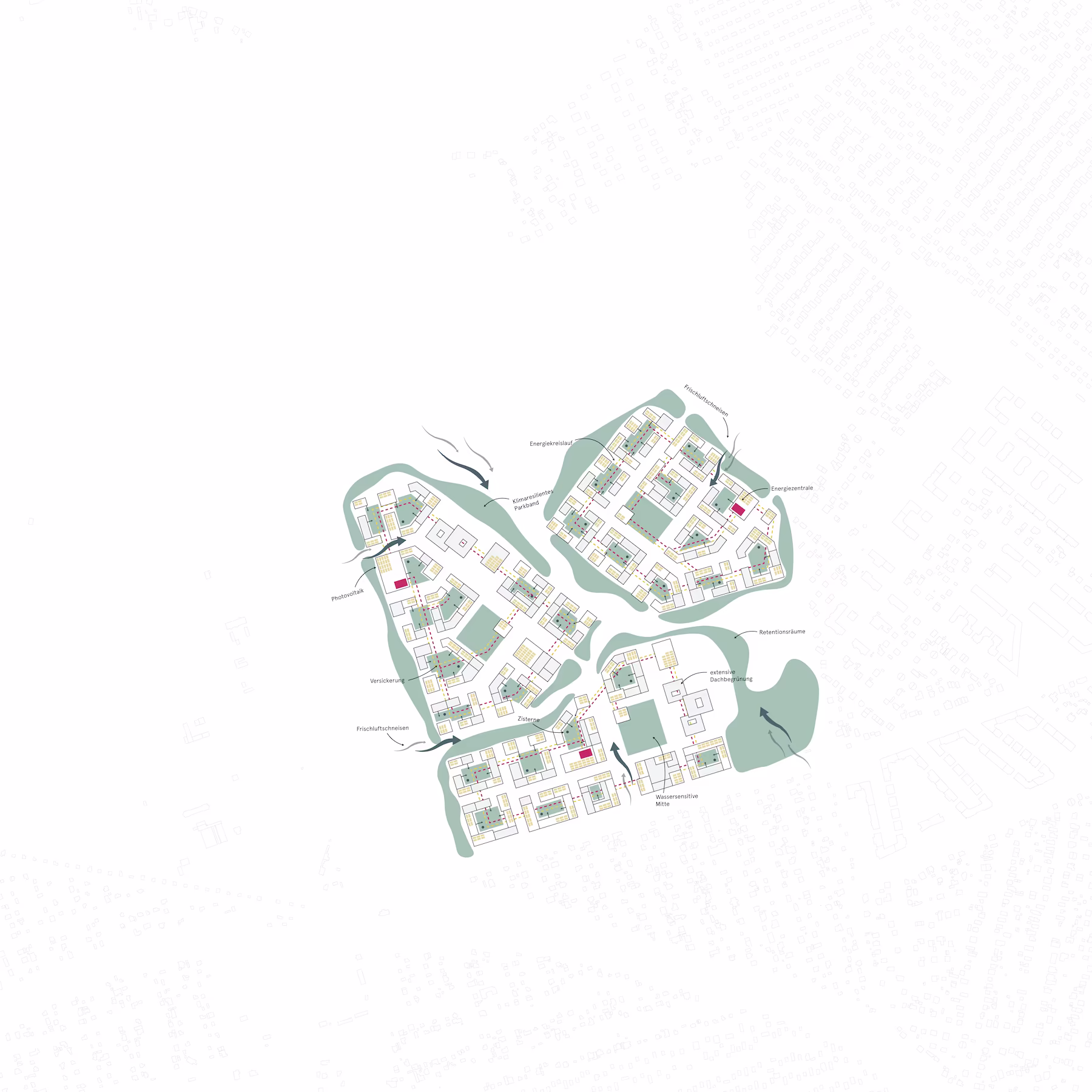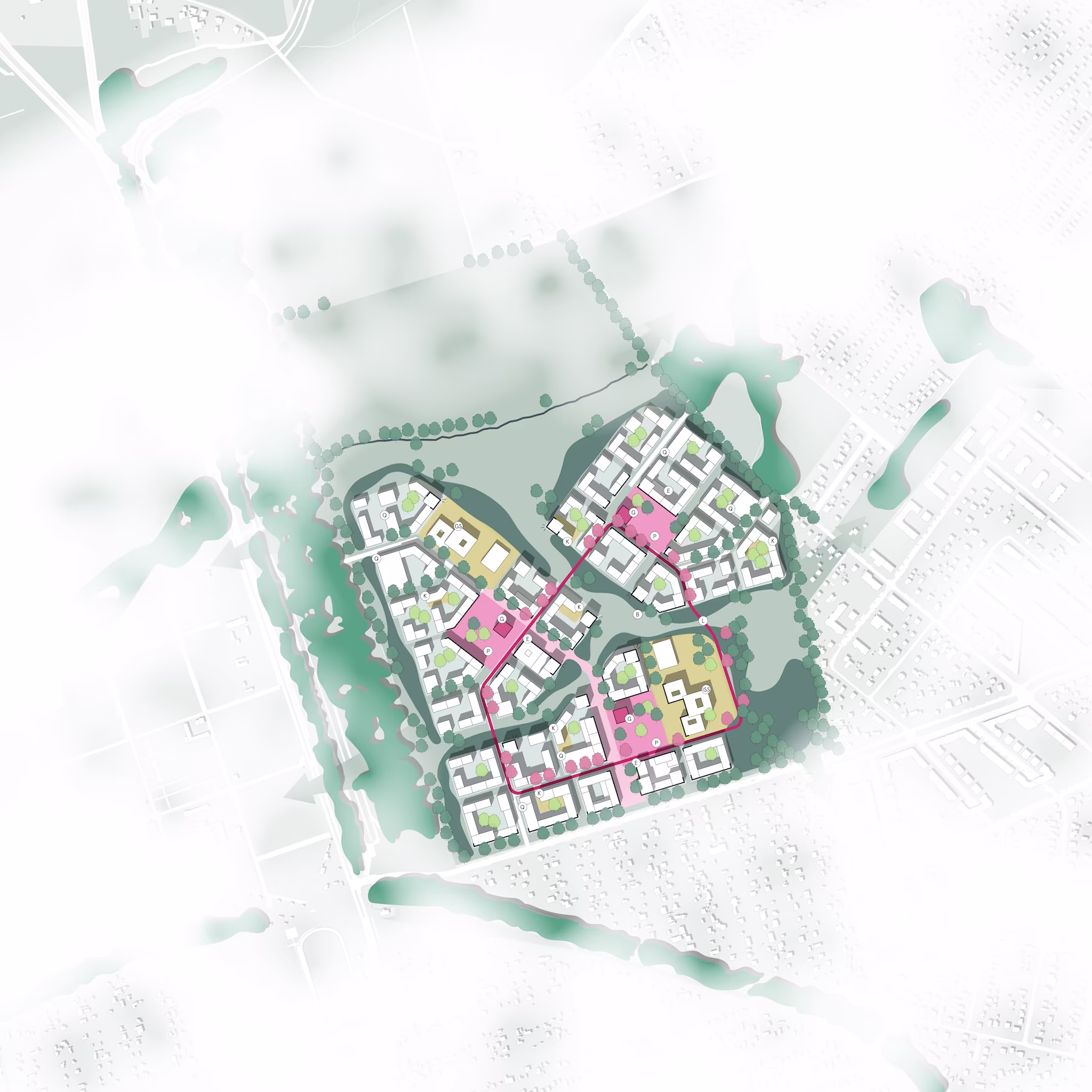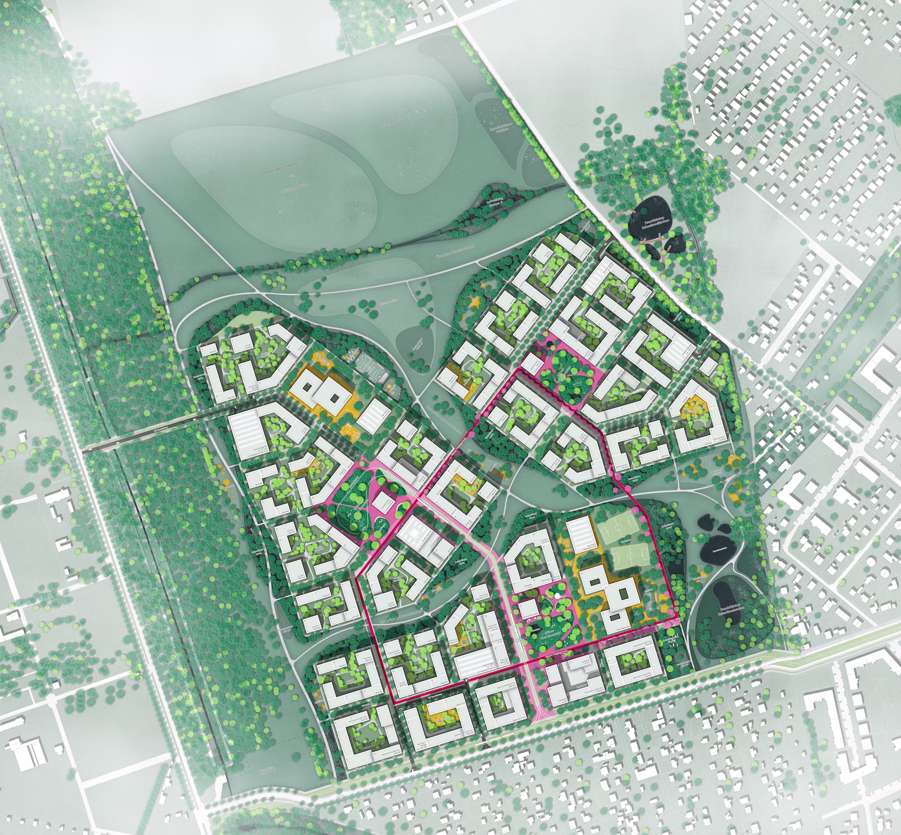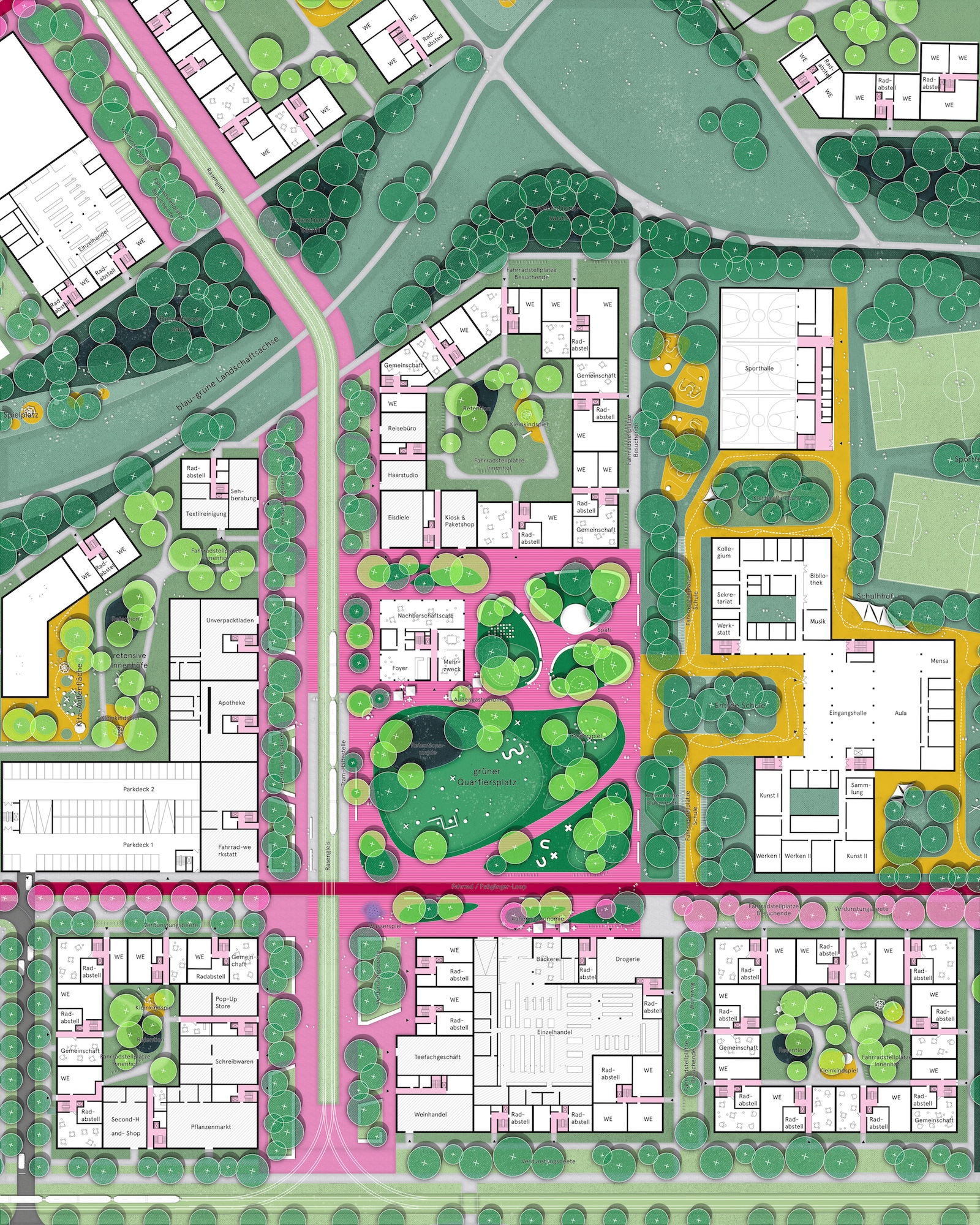Das Mobilitätskonzept haben wir unter dem Leitbild autoarmer, klima- und menschenfreundlicher Stadtteil entwickelt. Der Bau von zwei neuen Tram-Haltstellen stellt eine gute Anbindung an das bestehende ÖPNV-Netz sicher. Durch eine Ergänzung von Einzelhandel, Dienstleistungen und soziale Infrastruktur in den umliegenden Gebäuden der Haltestellen sollen diese Orte weiter an zentraler Bedeutung gewinnen. Um den ruhenden Verkehr aus den Innenbereichen des Quartiers rauszuhalten, sind Quartiersgaragen an den Eingängen des Quartiers geplant. Die Nahmobilität wird durch ein feinmaschiges Netz an Fuß- und Radwegen gestärkt. Eine Besonderheit bildet dabei der Quartiersloop. Ein fahrradfreundlicher, durchgängig gestalteter Rundweg durch das Quartier soll nicht nur die Erschließung sicherstellen, sondern auch die soziale Integration fördern. Durch ein differenziertes Netz an Grünräumen kann im Quartier das Prinzip der Schwammstadt umgesetzt werden. Verschiedene Freiräume wie die beiden großzügigen Quartiersparks, Spiel- und Sportflächen sowie nicht unterbaute Innenhöfe schaffen Retentionsflächen, welche gemeinschaftlich genutzt werden können und gleichzeitig die Biodiversität im Quartier fördern. Sie sind als halböffentliche Rückzugsorte für alle Generationen gestaltet. Über 1200 Baumneupflanzungen sorgen für eine langanhaltende Kühle und eine Schwammfähigkeit, sogar im Straßenbereich. Durch großflächige PV-Anlagen auf den Dachflächen kann benötige Energie direkt im Quartier erzeugt werden. Die Gebäude selbst sind als Plusenergiehäuser konzipiert, welche in Betrieb und Herstellung CO2-arm sind. Eine natürliche Luftzirkulation wird durch eine offene Gebäudestruktur gewährleistet. Um das Quartier zu einem lebendigen und durchmischten Wohnort zu machen, haben wir öffentliche Nutzungen entlang der zentralen Achsen und in den beiden Quartierszentren integriert. In den Erdgeschosszonen sind Werkstätten, Co-Working-Spaces, Nachbarschaftscafés und kulturelle Angebote vorgesehen. Des Weiteren entstehen zwei Generationshäuser als multifunktionale Knotenpunkte. Sie bieten Raum für Veranstaltungen, Begegnungen und gemeinwohlorientierte Nutzungen. Insgesamt soll ein Quartier mit hoher Alltagstauglichkeit entstehen, welches gleichzeitig für Wandel offen ist.