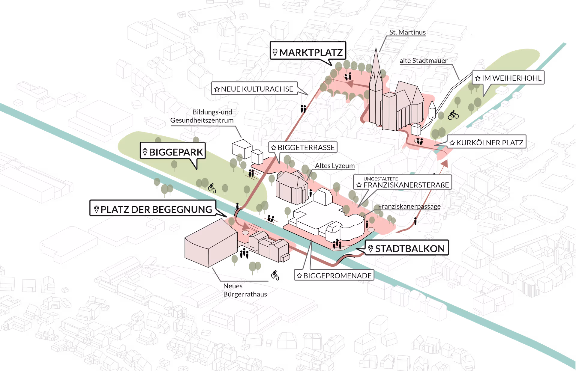 Der Entwurf zeichnet sich durch eine großzügige Freifläche aus, die als zusammenhängender Grünraum die Altstadt Olpes an das neu entstehende Bürgerrathaus anbindet und eine grüne Achse bildet. Dieses verbindende Element weist gleichzeitig eine hohe Aufenthaltsqualität auf und bietet ein gutes Wegenetz für den Fuß- und Radverkehr. Der gesamte Bereich des Biggeraums ist barrierefrei. Charakteristisch für den neuen Entwurf ist die Erlebbarkeit der Flüsse. Durch vier Brückenschläge, die Biggepromenade und zwei Terrassen am Fluss werden die Flussräume und der Mündungsbereich sichtbar gemacht. Besonders die Treppenanlage bis an die Bigge sorgt für eine gute Zugänglichkeit des Gewässers. Insgesamt erzeugen die entsiegelten Flächen eine hohe Biodiversität und hervorragende Freizeitmöglichkeiten.