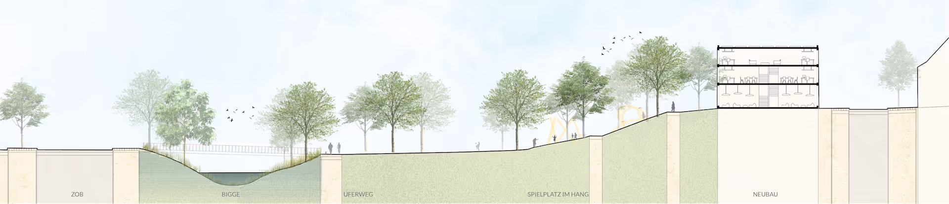 Auch das Verhältnis des Grünraums zur Stadt wird angemessen gesteuert. Durch die Mischverkehrsfläche zwischen Altstadt und Biggeraum knüpft dieser nahtlos an den Stadtraum an. Entsprechend leiten die zwei neu entstehenden Gebäude, die an die Altstadtbebauung angrenzen und ein Bildungs- und Gesundheitszentrum beherbergen sollen, in den Biggepark über, ohne ihn in seiner Freiraumqualität einzuschränken. Wir freuen uns riesig über den 1. Rang im Team mit Club L94 Landschaftsarchitekten!