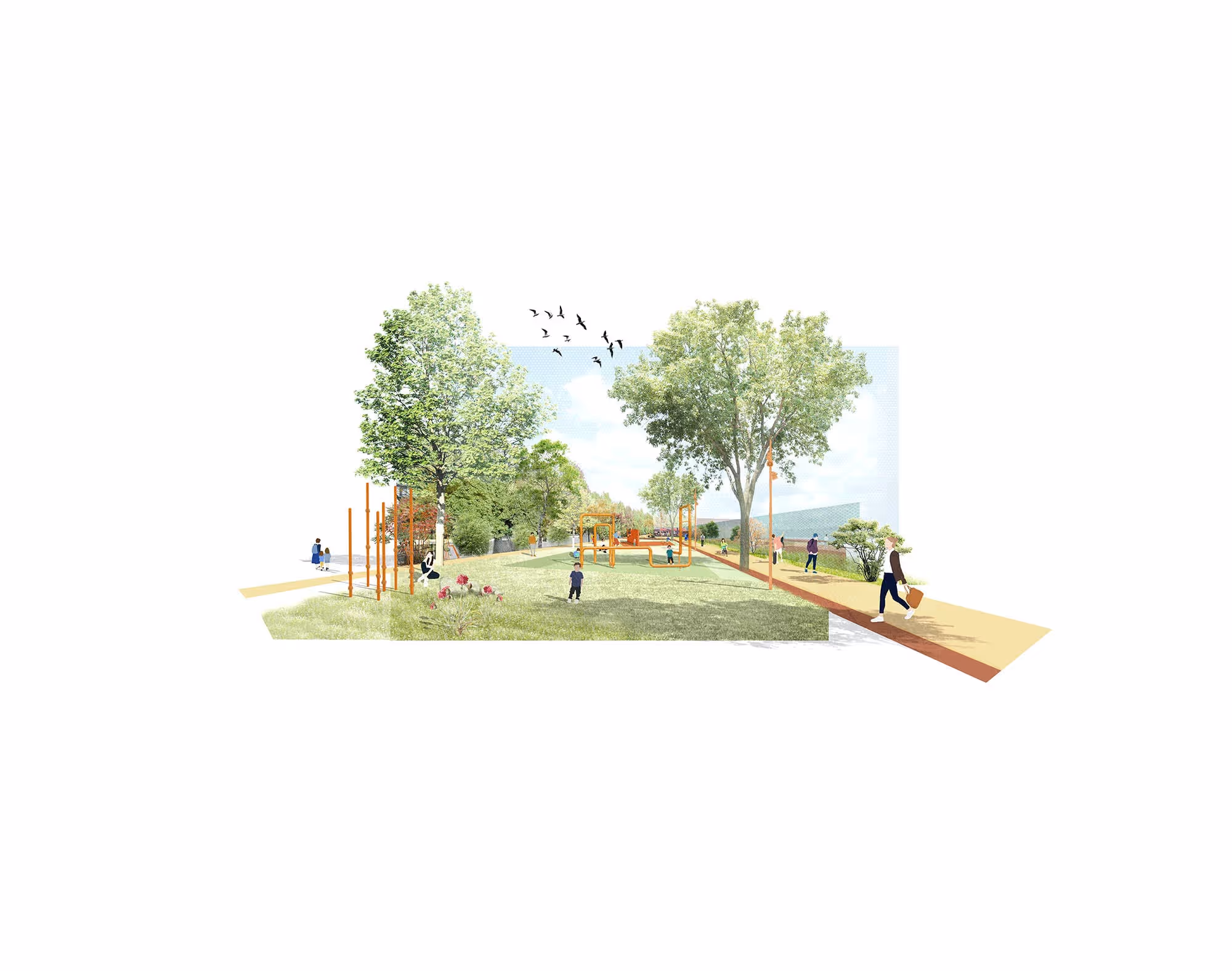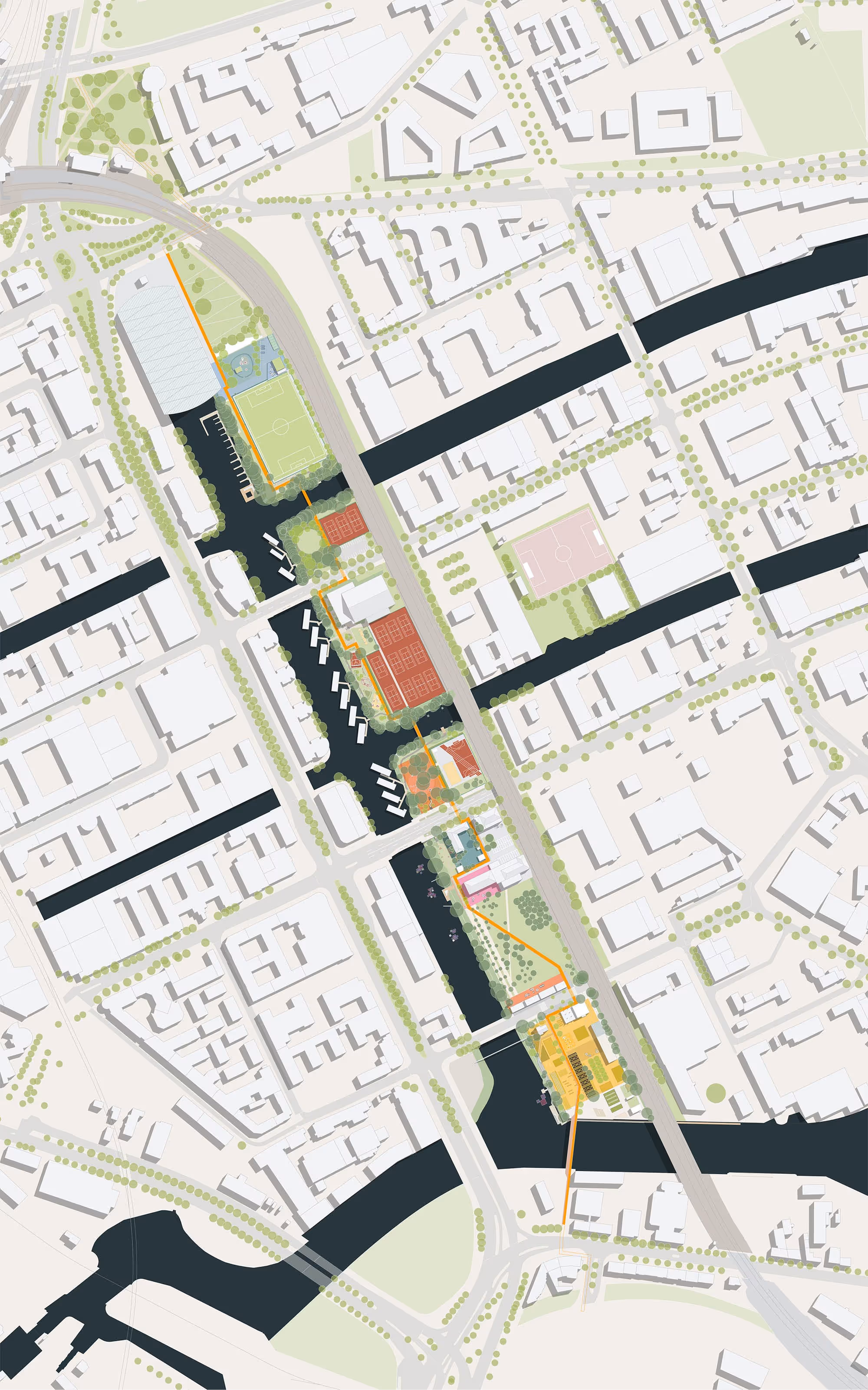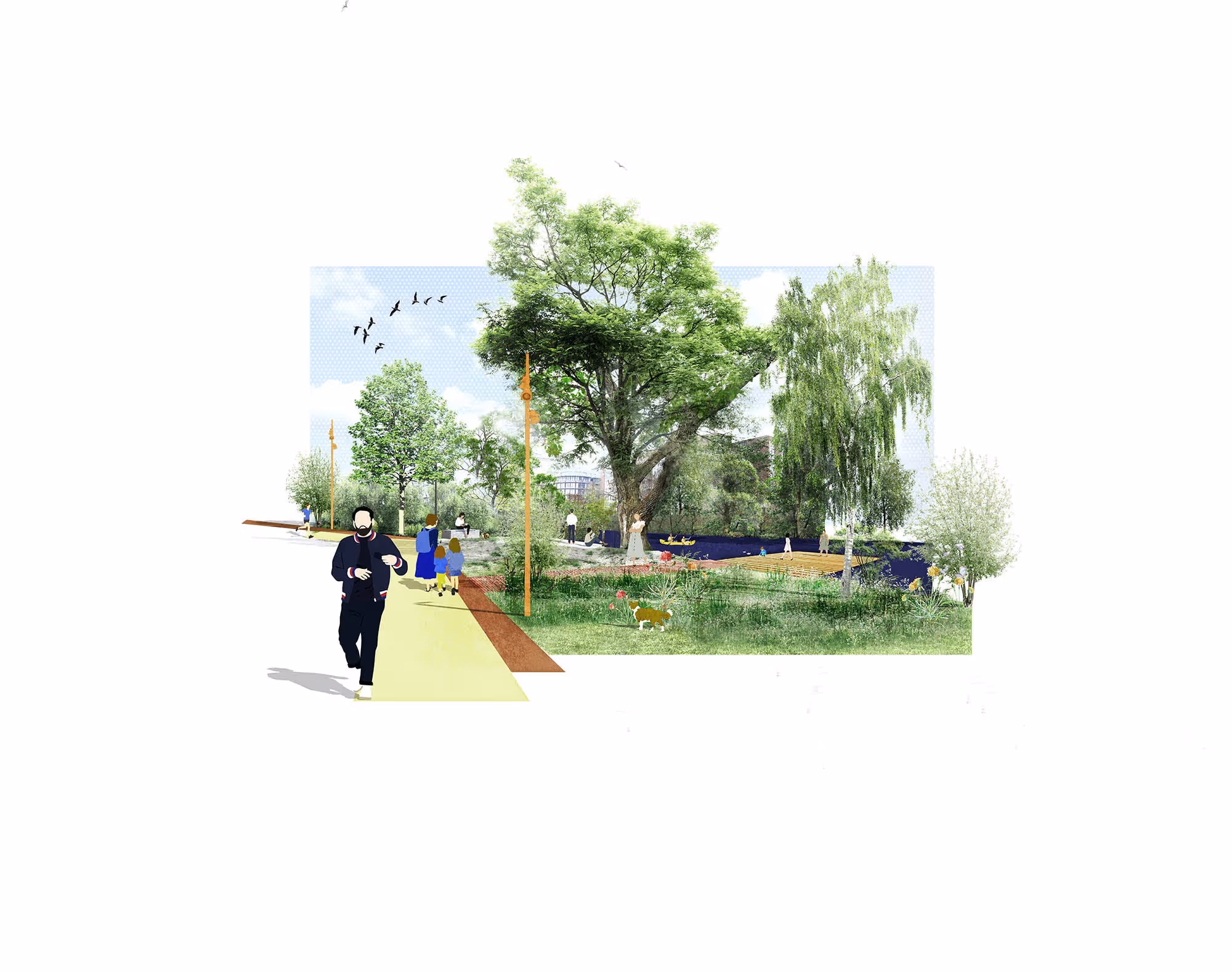 Die bestehende Freiraumstruktur wird neu geordnet und situativ ergänzt. Die neu gewonnen Flächen werden großzügig offengehalten, um die Durchlässigkeit und Zusammengehörigkeit zu stärken. Eine vielfältige Abfolge an Freiraumsequenzen entsteht. Ein zentraler barrierefreier Hauptweg mit „Wegbegleitern“ (Mobiliar) verknüpft die Räume und bindet den Park als Einheit zusammen. An den Straßen werden neue Übergänge und Eingänge geschaffen. Die Grenzen werden klar definiert und präzise gestaltet. Darüber hinaus werden Ufersituationen und Wasserzugänge geschaffen. Ein zentraler Hauptweg verknüpft die unterschiedlichen Räume und Akteur*innen und bindet den Park zusammen.