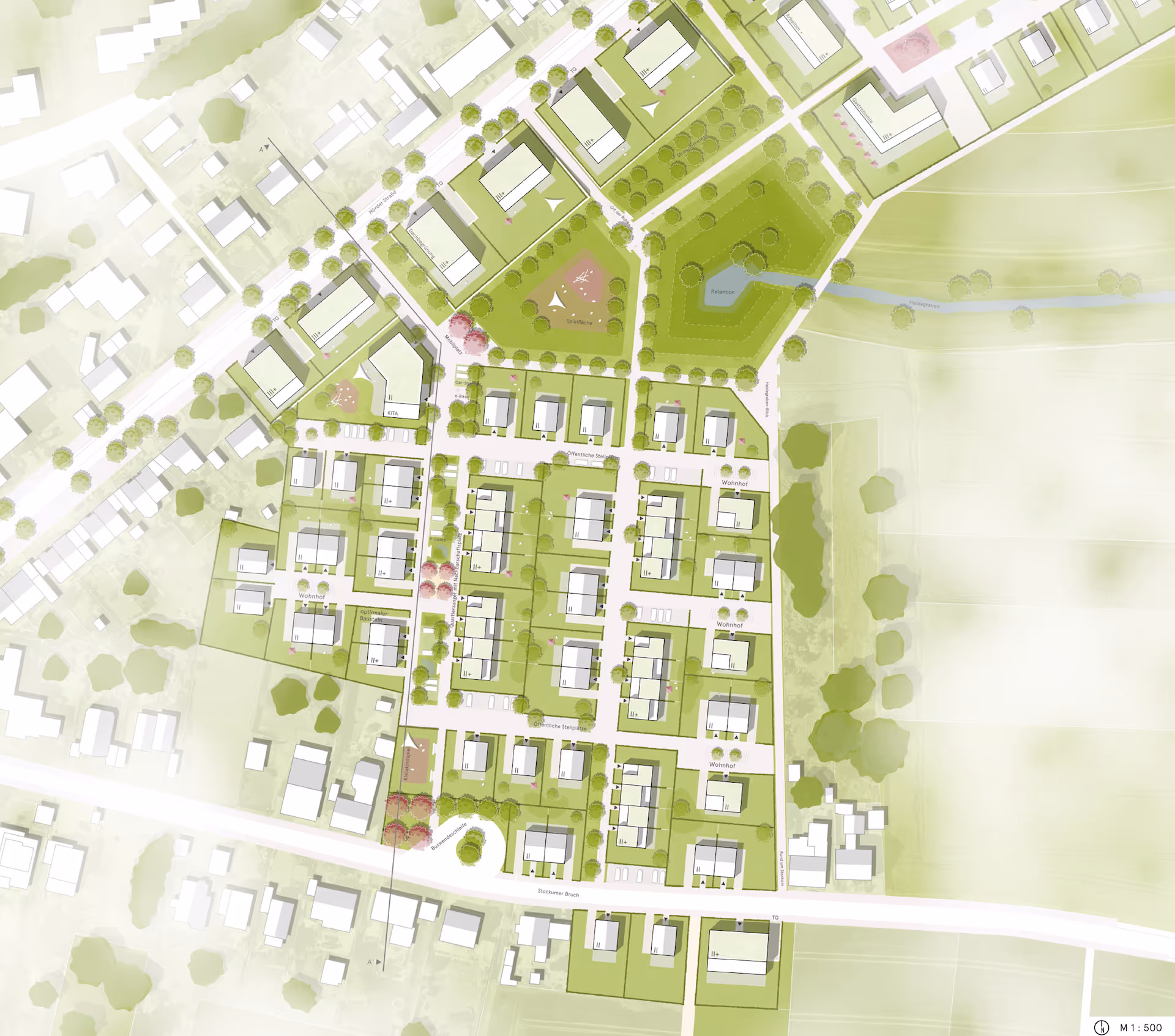 Im Zuge einer Mehrfachbeauftragung haben wir im Wittener Ortsteil Stockum Ein städtebauliches Konzept ein neues Wohnquartier entworfen, welches als neuer Stadtbaustein die vorhandene Siedlungsstruktur sinnvoll ergänzt und arrondiert. Das „Neue Quartier am Heidegraben“ formt eine attraktive Siedlung, die verschiedenste Zielgruppen anspricht.