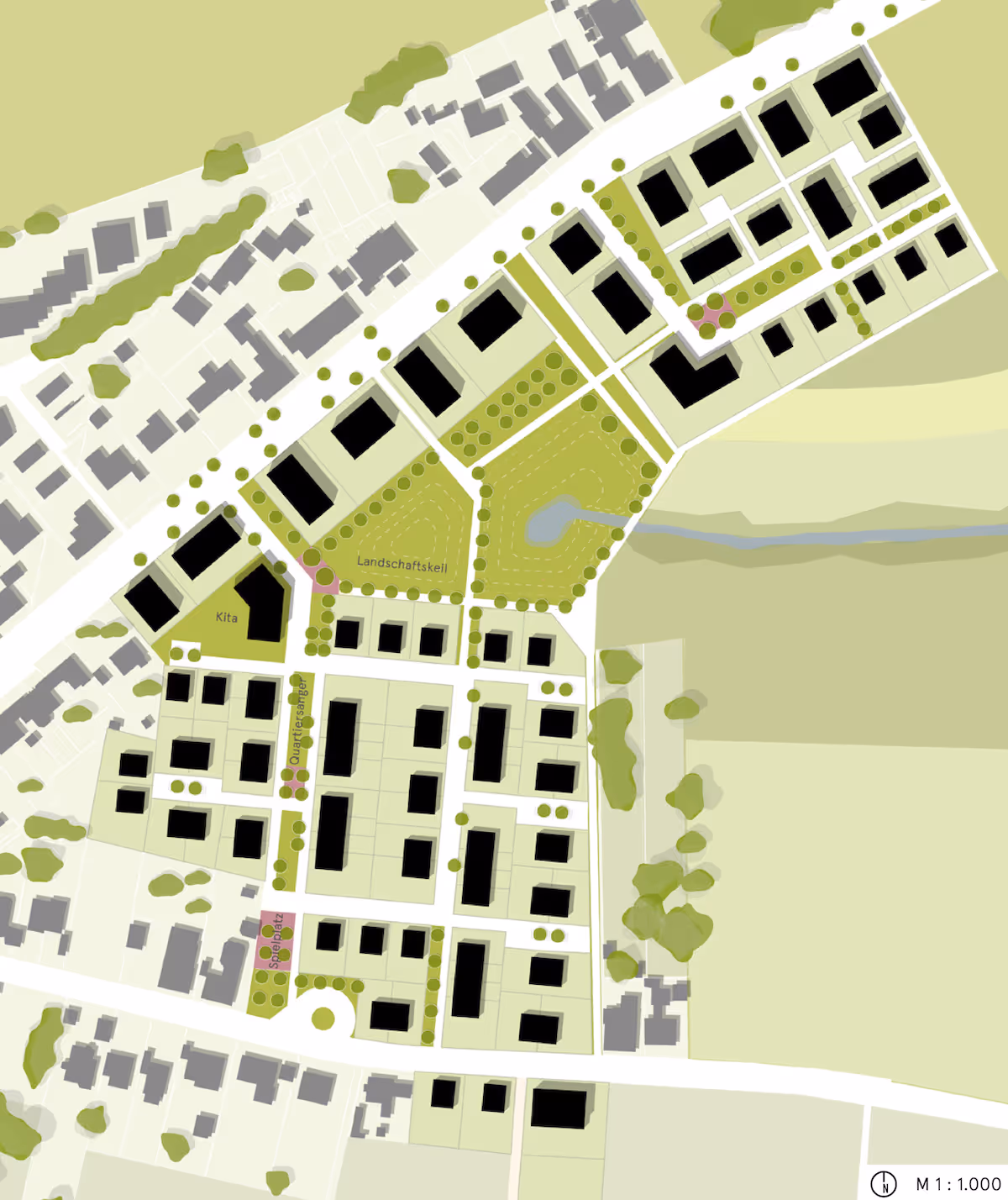 Das städtebauliche Konzept formt ein solides räumliches Grundgerüst, welches die bestehenden Strukturen aufgreift und die vorhandene Körnigkeit sowie typlogische Vielfalt aufgreift. Diese Qualitäten greift die neue Siedlung auf und erzeugt hiermit eine identitätsstiftende Struktur. Das Quartier am Heidegraben stellt den nachbarschaftlichen Gedanken in den Vordergrund und übertragt ihn in ein angemessenes räumliches Gerüst um Wohnhöfe sowie einen Quartiersanger. Die Wohnhöfe erzeugen Orte für ein nachbarschaftliches Miteinander und bieten Gelegenheit für Austausch und Begegnung.