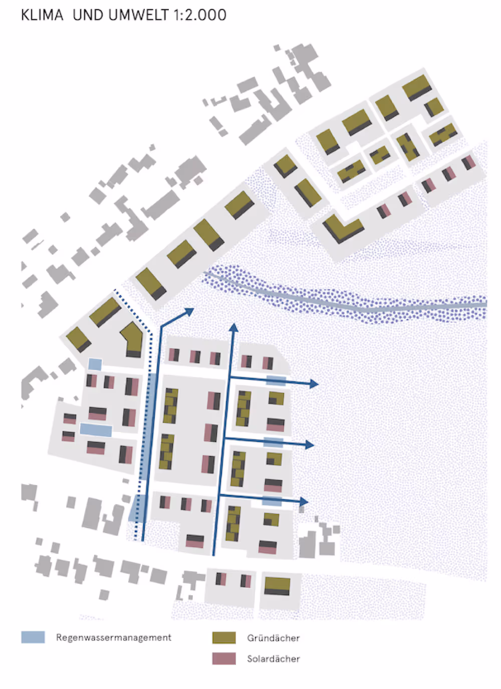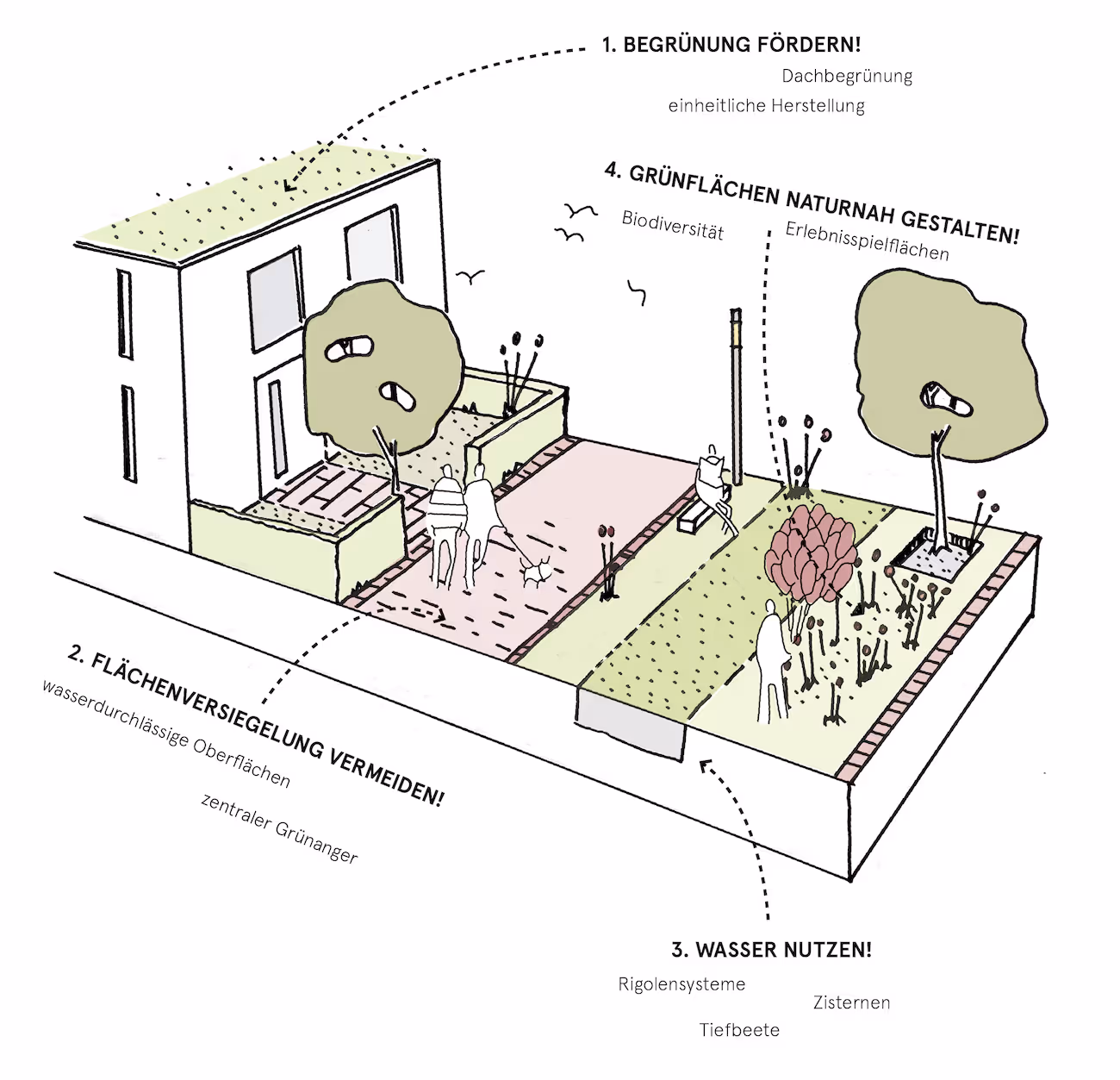 Das Quartier soll den Gestaltungsprinzipien der Schwammstadt nachkommen und dabei grünblaue Infrastrukturen einbinden, sowie eine Flächenversiegelung vermeiden und Grünflächen naturnah gestalten.