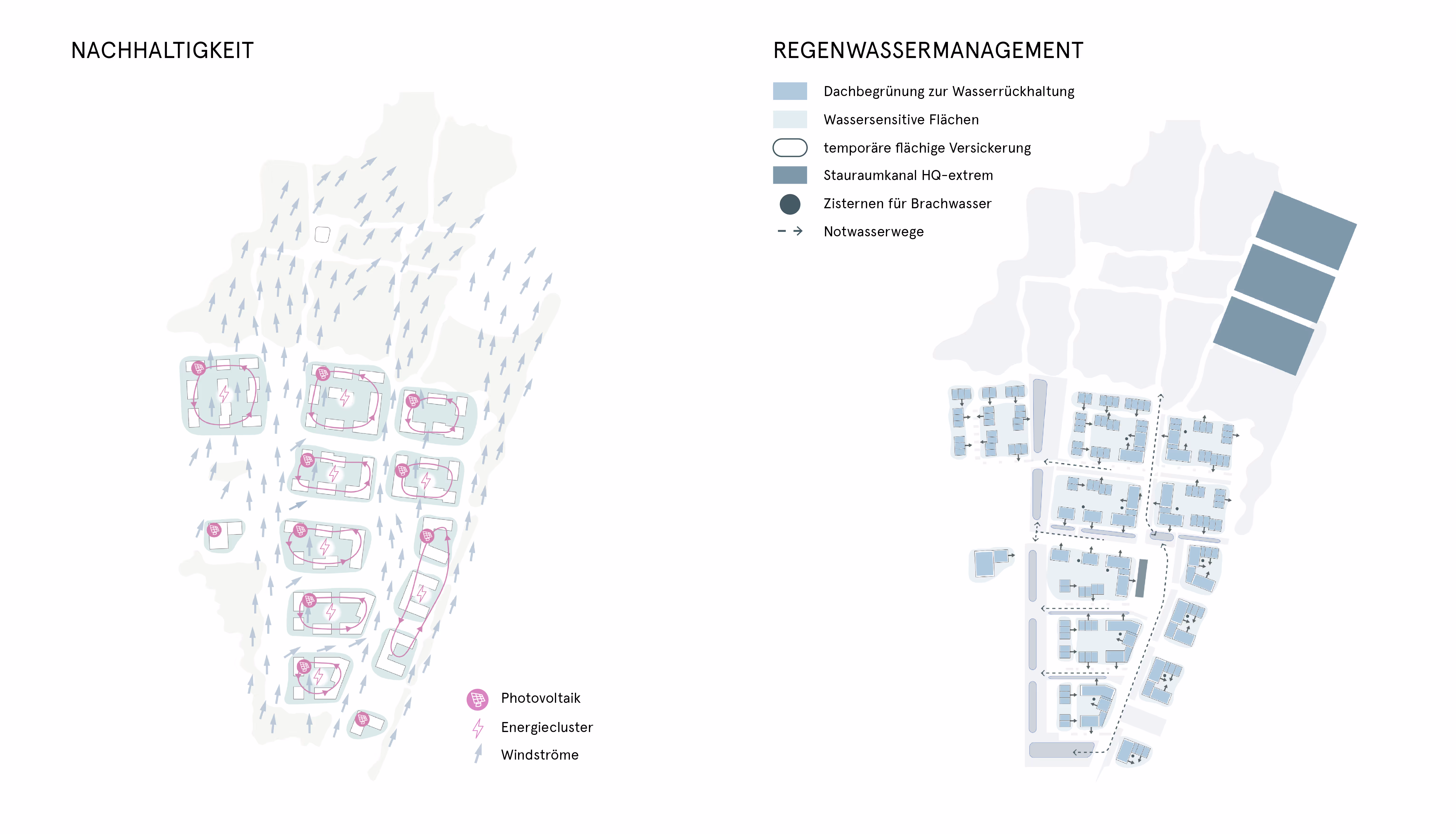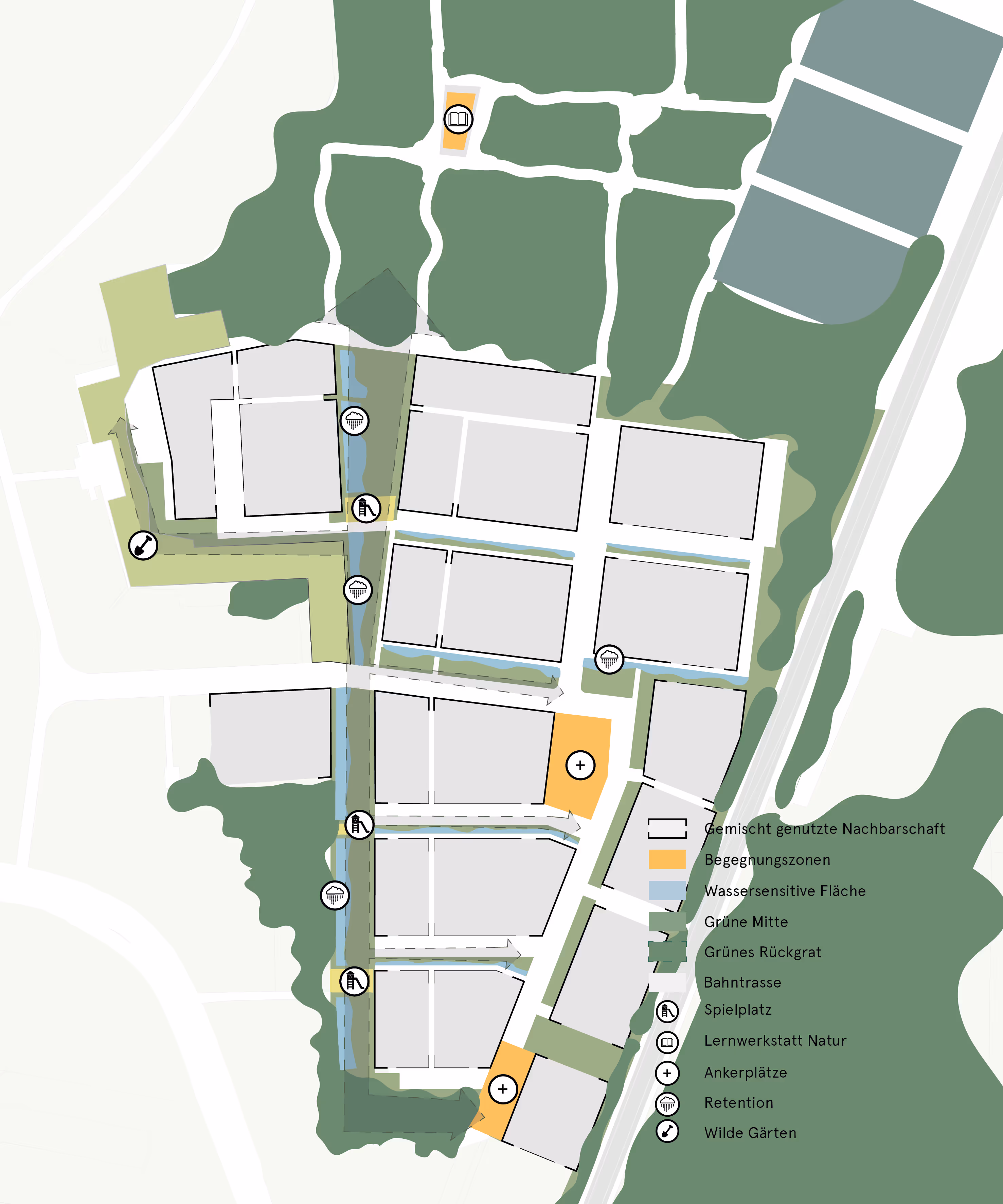 Unser Vorschlag für das Quartier im Dortmunder Norden sieht als zentrale Elemente zwei Freiraumstrukturen vor. Zum einen bildet der Entwurf ein in Nord-Süd-Richtung verlaufendes grünes Rückgrat, das die wertvollen Waldflächen im Norden des Quartiers naturnah erschließt. Zum anderen schlägt er eine attraktive Quartiersmitte vor, in der an einer Abfolge von zwei Quartiersplätzen quartiersbezogene Dienstleistungen angesiedelt werden, die eine Verzahnung innerhalb des Quartiers und mit den Siedlungsbereichen der Nachbarschaft gewährleisten. Die neu geschaffene Bebauung bietet unterschiedliche Gebäudetypologien, die verschiedene Zielgruppen ansprechen und so eine Durchmischung im Quartier erzeugen. Das Angebot reicht vom Geschosswohnungsbau bis hin zu Doppel- und Reihenhäusern, so dass eine vielfältige Bewohnerschaft entsteht. Dem Fuß- und Radverkehr kommt im Quartier eine hohe Bedeutung zu. Der Standortvorteil des Bahnanschlusses wird optimal genutzt, so dass der motorisierte Individualverkehr in den Hintergrund tritt. Die östlich verlaufende Bahntrasse wird durch Lärmschutzwände vom neuen Quartier getrennt. Das Quartier wird als klimaangepasste Siedlung entwickelt, wobei den wassersensiblen Grünstrukturen eine besondere Bedeutung zukommt. Zur Regenrückhaltung und Zwischenspeicherung wird das Regenwasser über Gründächer oder offene Retentionsflächen im Freiraum aufgenommen und in dezentralen Zisternen gesammelt, so dass es entweder genutzt werden kann oder zur Kühlung des Quartiers beiträgt. So entsteht in Dortmund ein zukunftsweisendes Quartier.