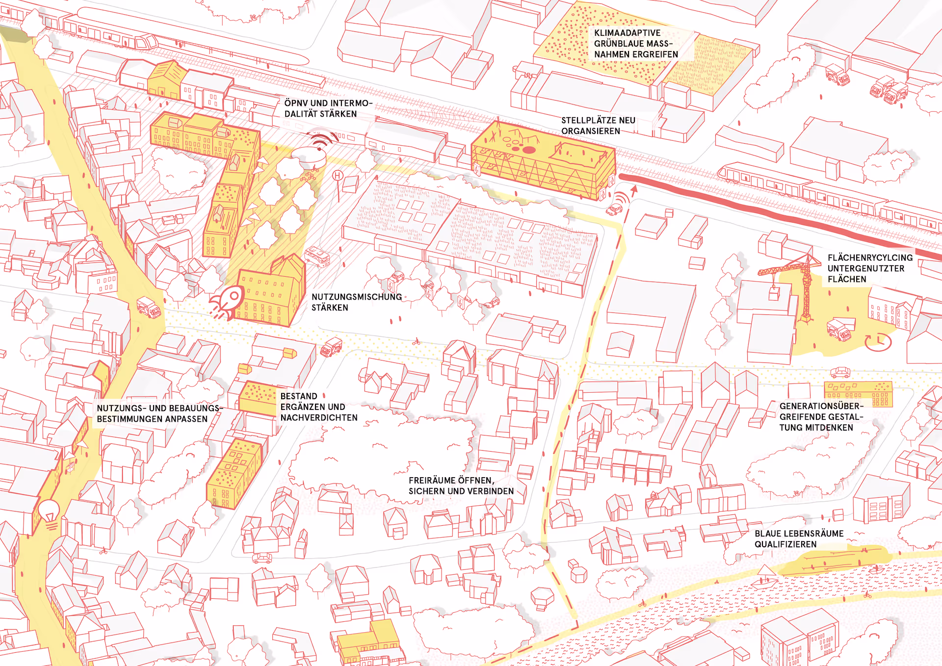 Darüber hinaus profitiert die Innenstadt von einem differenzierten Radwegenetz, einer Fußgängerzone mit Aufenthaltsqualitäten und den großzügigen Grünflächen im Zentrum. Dennoch weist die Innenstadt Defizite auf, die sich unter anderem in städtebaulichen Maßstabssprüngen, Leerständen und fehlenden Angeboten für Kinder und Jugendliche widerspiegeln.