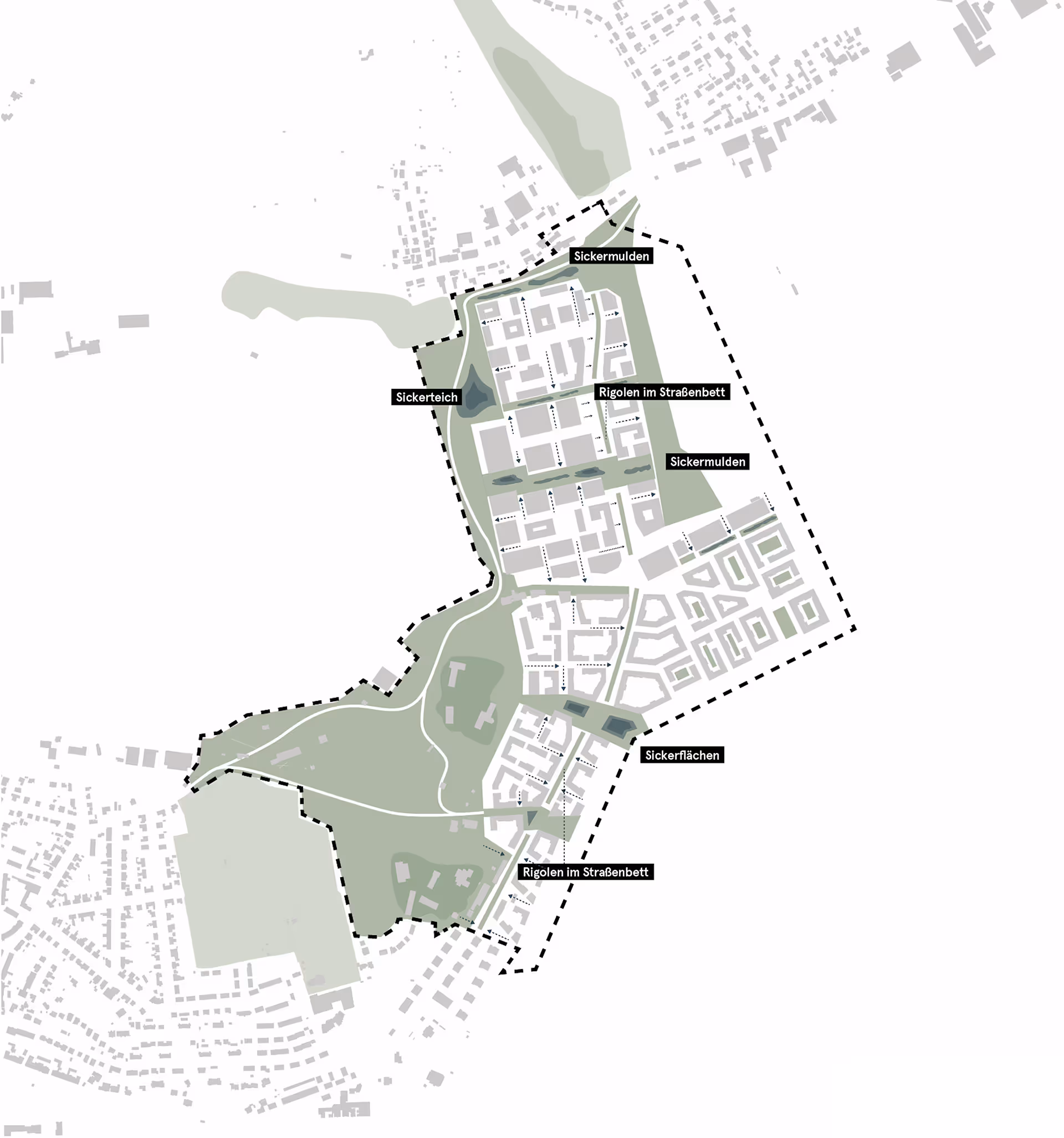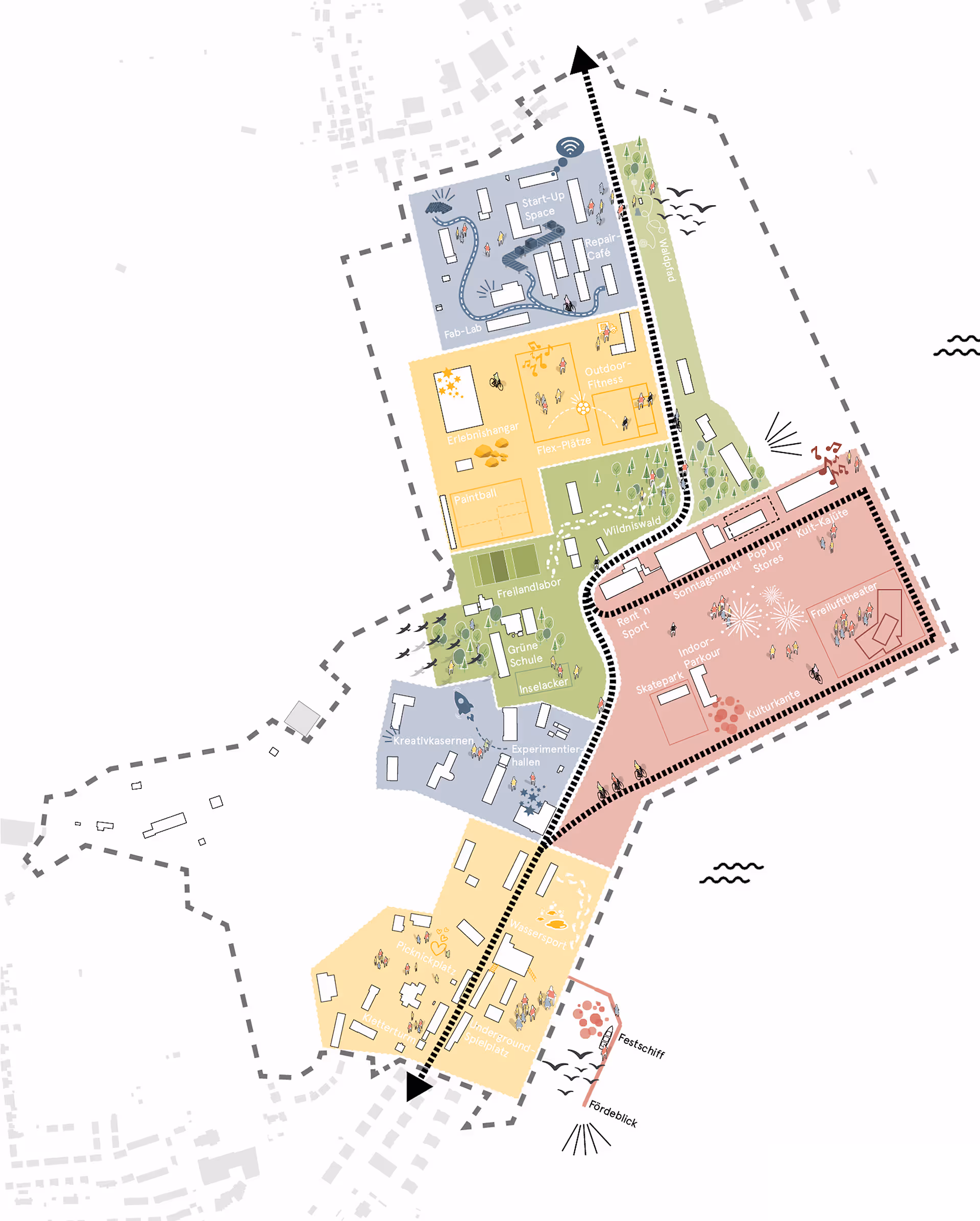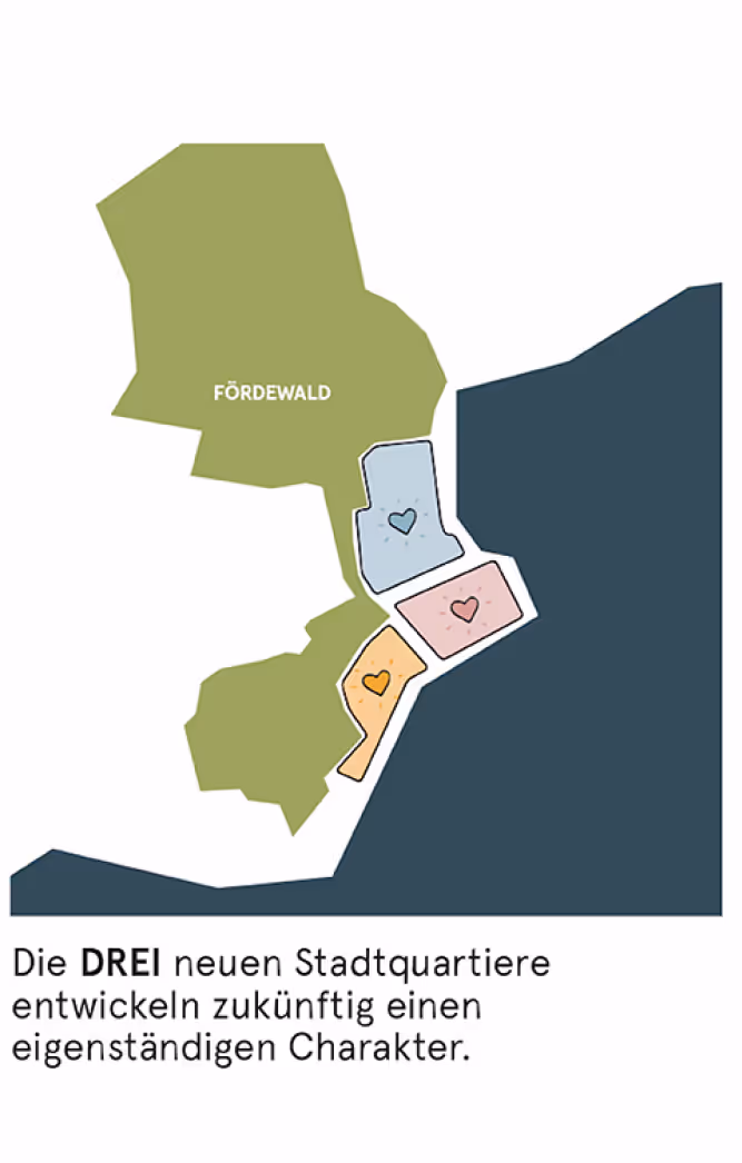 Das Areal wird von der zentralen Quartiersachse in nord-südlicher Richtung strukturiert. Die Quartiersachse bildet die zentrale Erschließung für die Verkehrsträger des MIV, ÖPNV sowie Fuß- und Radverkehrs. Außerdem dient sie als Orientierungsraum und beinhaltet zahlreiche Retentionsflächen. Sie stellt den Anschluss des Stadtteils nach Holtenau im Süden und Pries-Friedrichsort im Norden dar. Der neue Stadtteil profitiert von einer besonderen Lage am Wasser, die für alle zukünftigen Bewohner*innen aber auch Besucher*innen erlebbar gemacht werden soll.