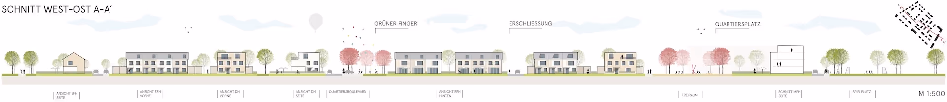 Die Grünfugen dienen als multicodierte Freiräume mit Erholungsfunktion, Retentionsflächen und Spiel- und Sportbereichen. Im Bereich des Landwirtschaftsbetriebs wird die Grünfuge als Lärmschutzwall ausgestaltet und schützt somit die Wohnbebauung vor Emissionen. Weiteren Lärmquellen wird mit einer verdichteten Anordnung von Mehrfamilienhäusern begegnet. Dabei werden neben Mehrfamilientypologien zum überwiegenden Teil Ein- und Zweifamilienhäuser, sowie Reihenhäuser entwickelt. Die Flexibilität der Typologien erlaubt eine Realisierbarkeit aller Produkte des Grundstückseigentümers und Entwicklers Deutsche Reihenhaus AG.